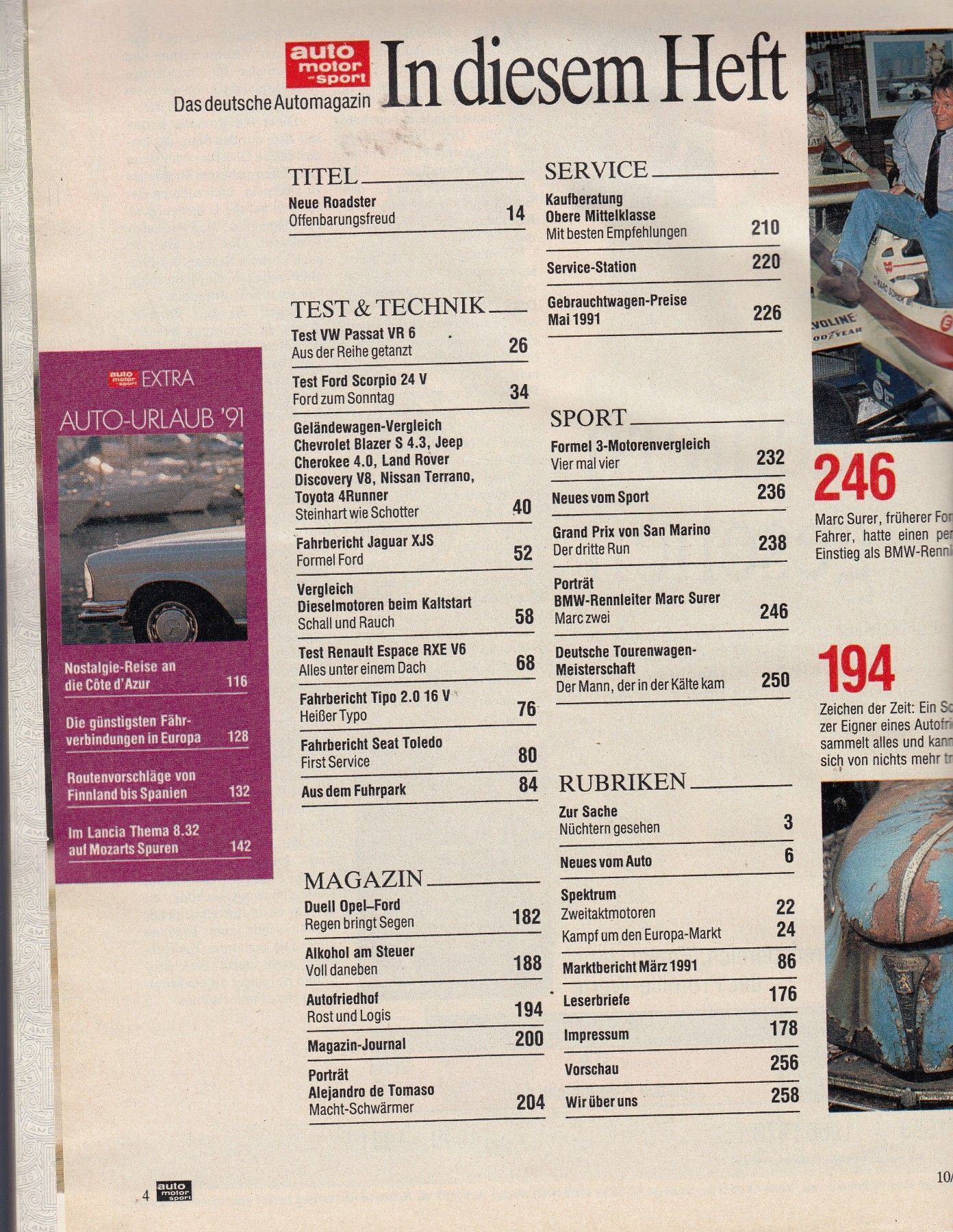 auto motor und sport Heft 10 - 3. Mai 1991 Test & Technik: VW Passat VR6, Ford Scorpio 24 V, Jaguar XJS, Renault Espace RXE V6, Fiat Tipo 2.0 16V, Seat Toledo Geländewagen Vergleich: Chevrolet Blazer S 4,3, Jeep Cherokee 4.0, Land Rover Discovery V8, Nissan Terrano, Toyota 4 Runner Porträt: Alej... Mehr