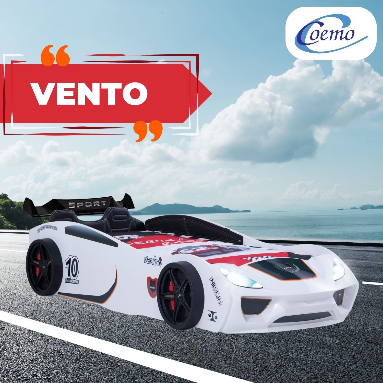 Vento Sport Autobett in Exklusiv-Ausführung Lassen uns von der Rennstrecke träumen! Vento ist ein Autobett mit Sportausführung für Kinder. Das mitgelieferte Sportpack-Rückenpolster in klassischer Kunstlederausführung in Schwarz macht den Vento zu etwas ganz Besonderem. Die exklusive Ausführung mit g