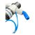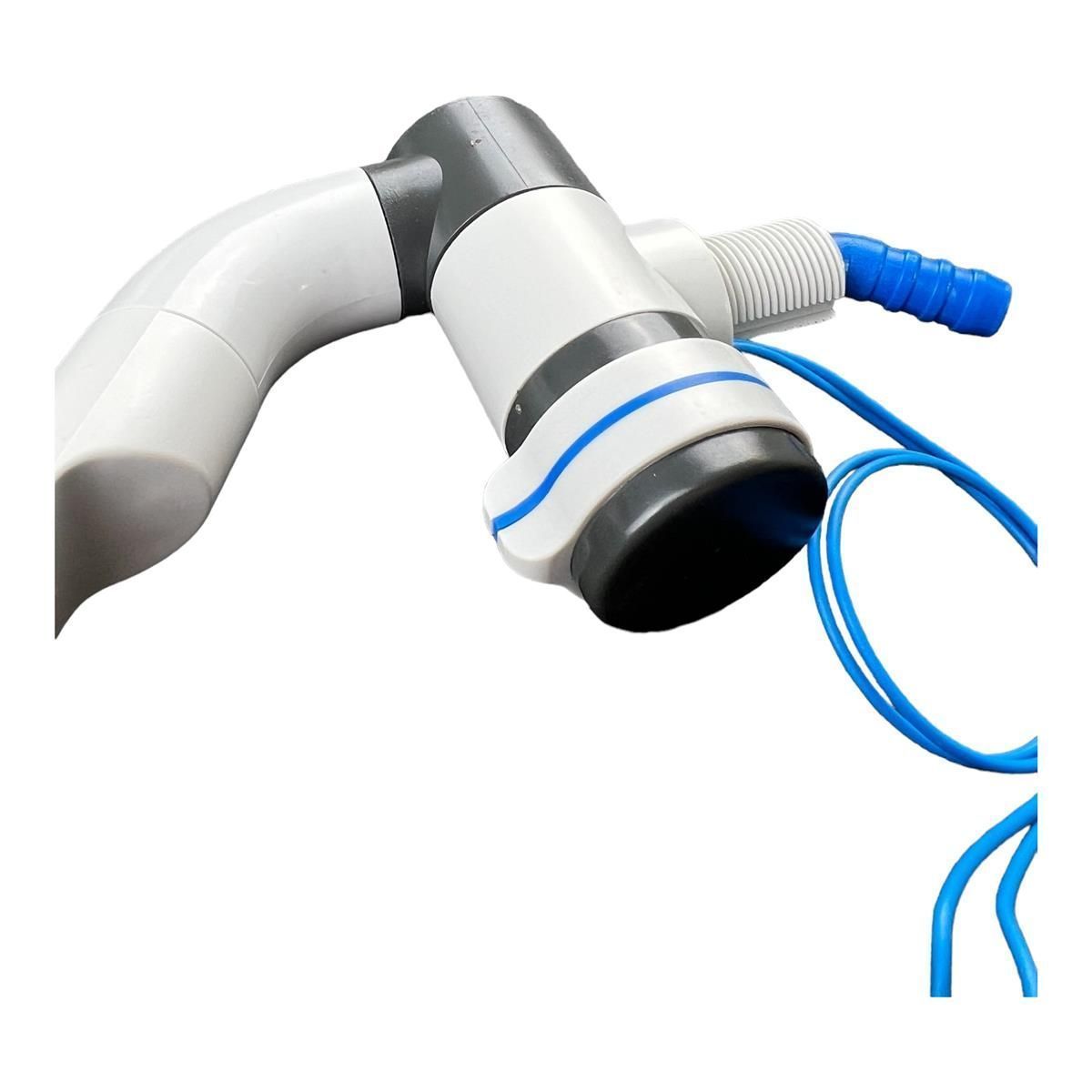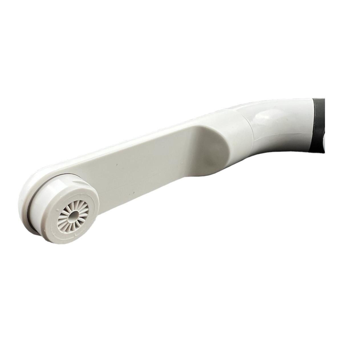 Kompakter Wasserhahn aus grauem Kunststoff. Drehbarer Auslauf und Hahn, 80°C Temperaturgrenze, 5 bar Maximaldruck.