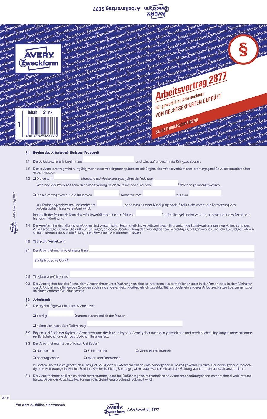 AVERY Zweckform Avery Zweckform 2877 Arbeitsvertrag, DIN A4, für gewerbl. Arbeitnehmer, blau(T)