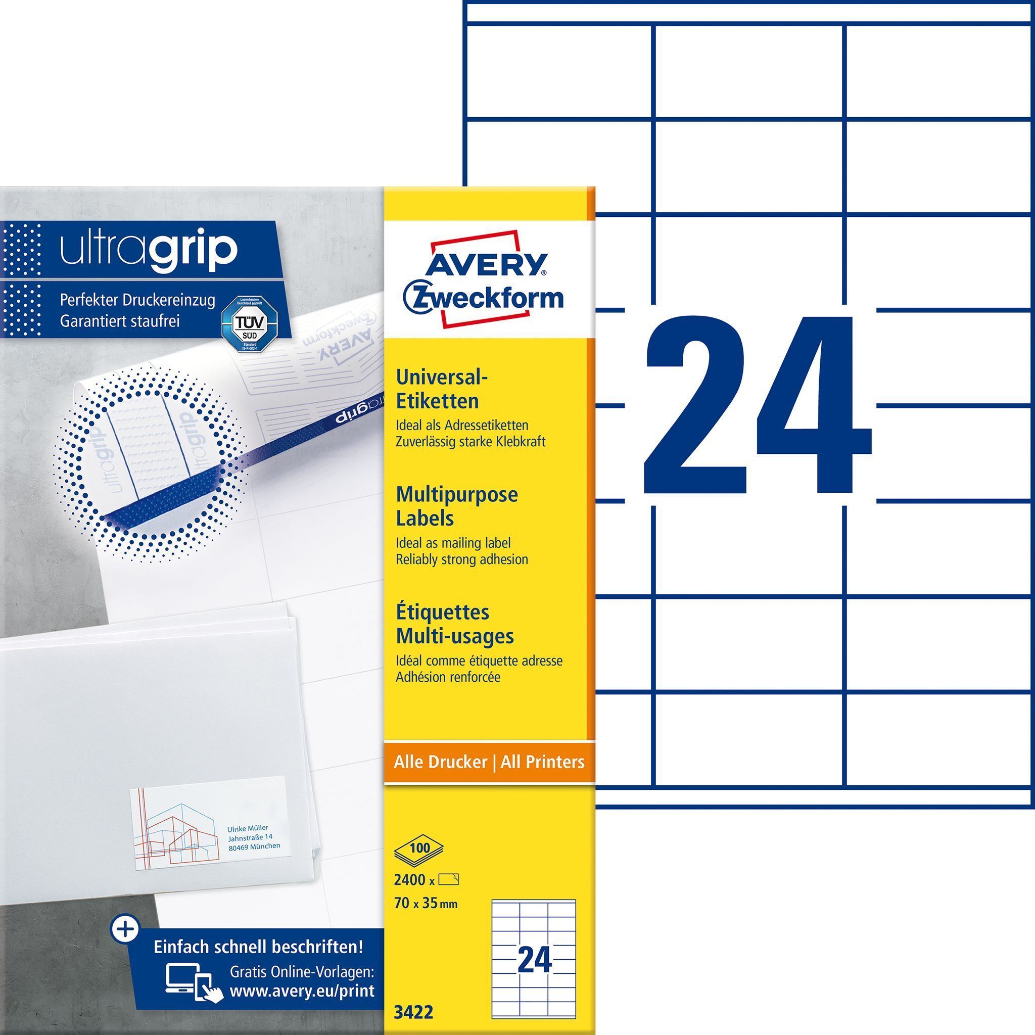 AVERY Zweckform Avery Zweckform® 3422 3422 Universal-Etiketten ultragrip - 70 x 35 mm, weiß, 2.400 Et