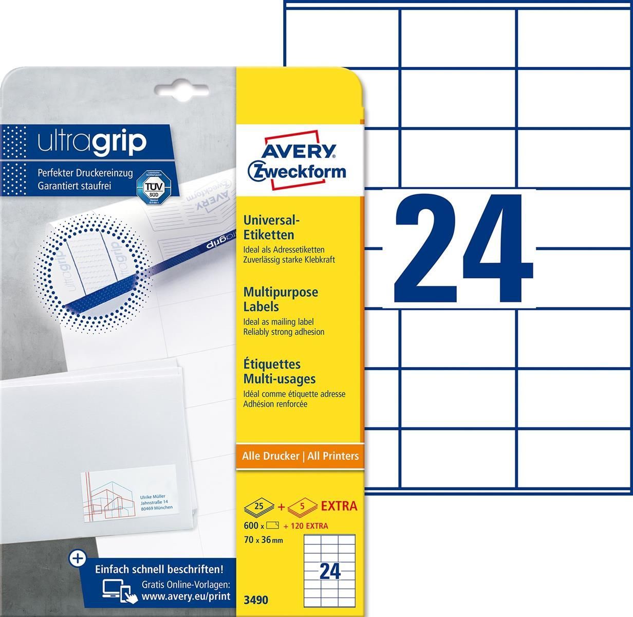 AVERY Zweckform Avery Zweckform® 3490 Universal-Etiketten ultragrip - 70 x 36 mm, weiß, 720 Etiketten
