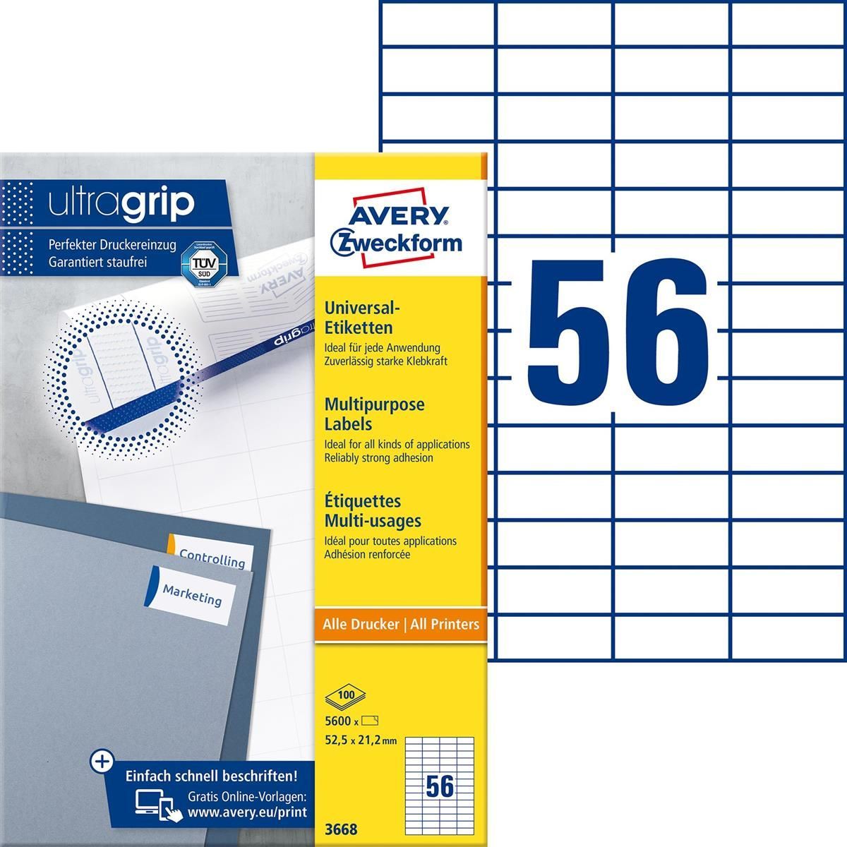 AVERY Zweckform Avery Zweckform® 3668 3668 Universal-Etiketten ultragrip - 52,5 x 21,2 mm, weiß,