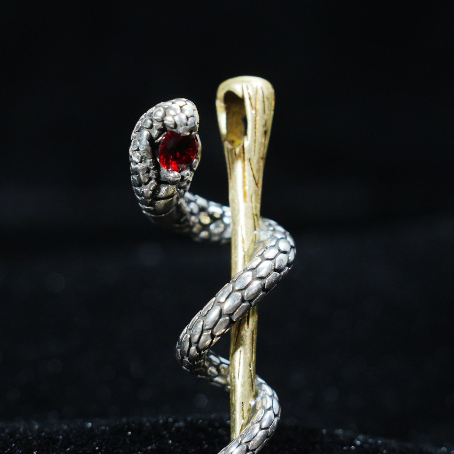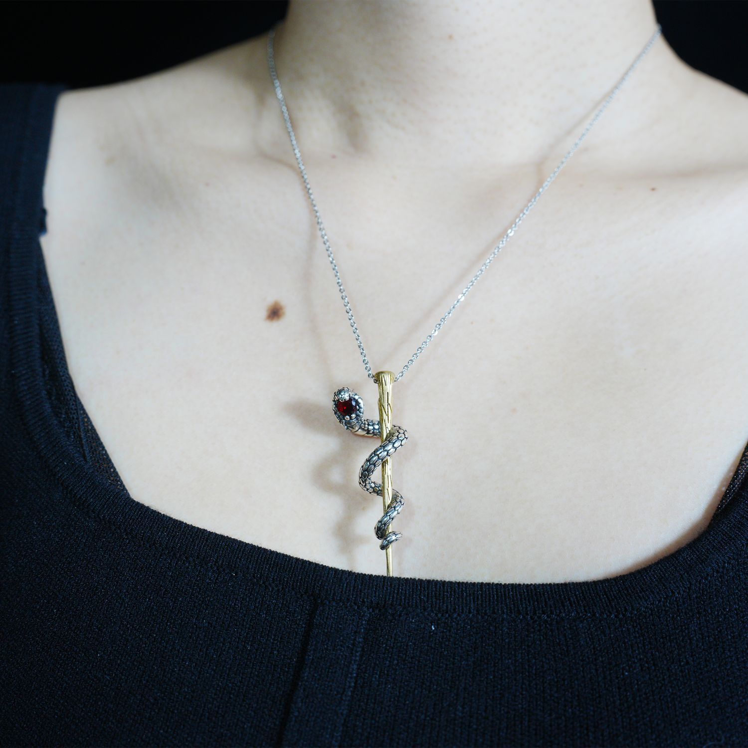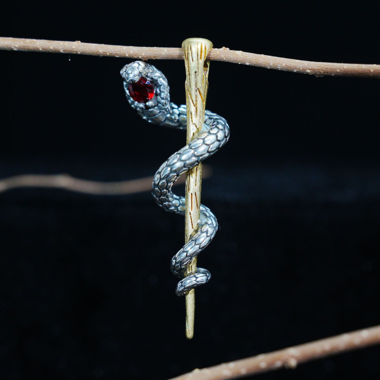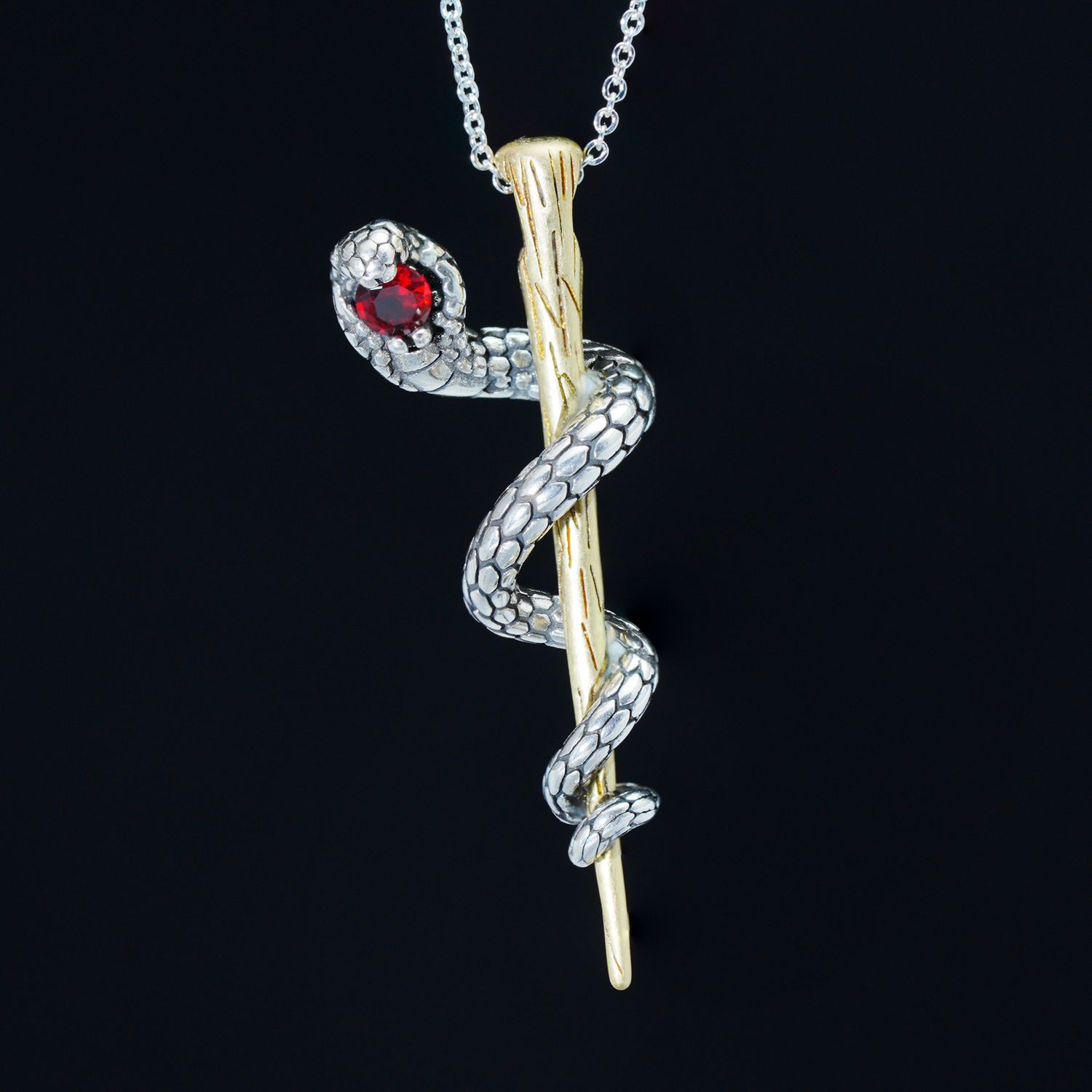 Awakening Serpent Pendant – Wand-Shaped Snake Necklace with Red Gem Eye | Gothic Tali
