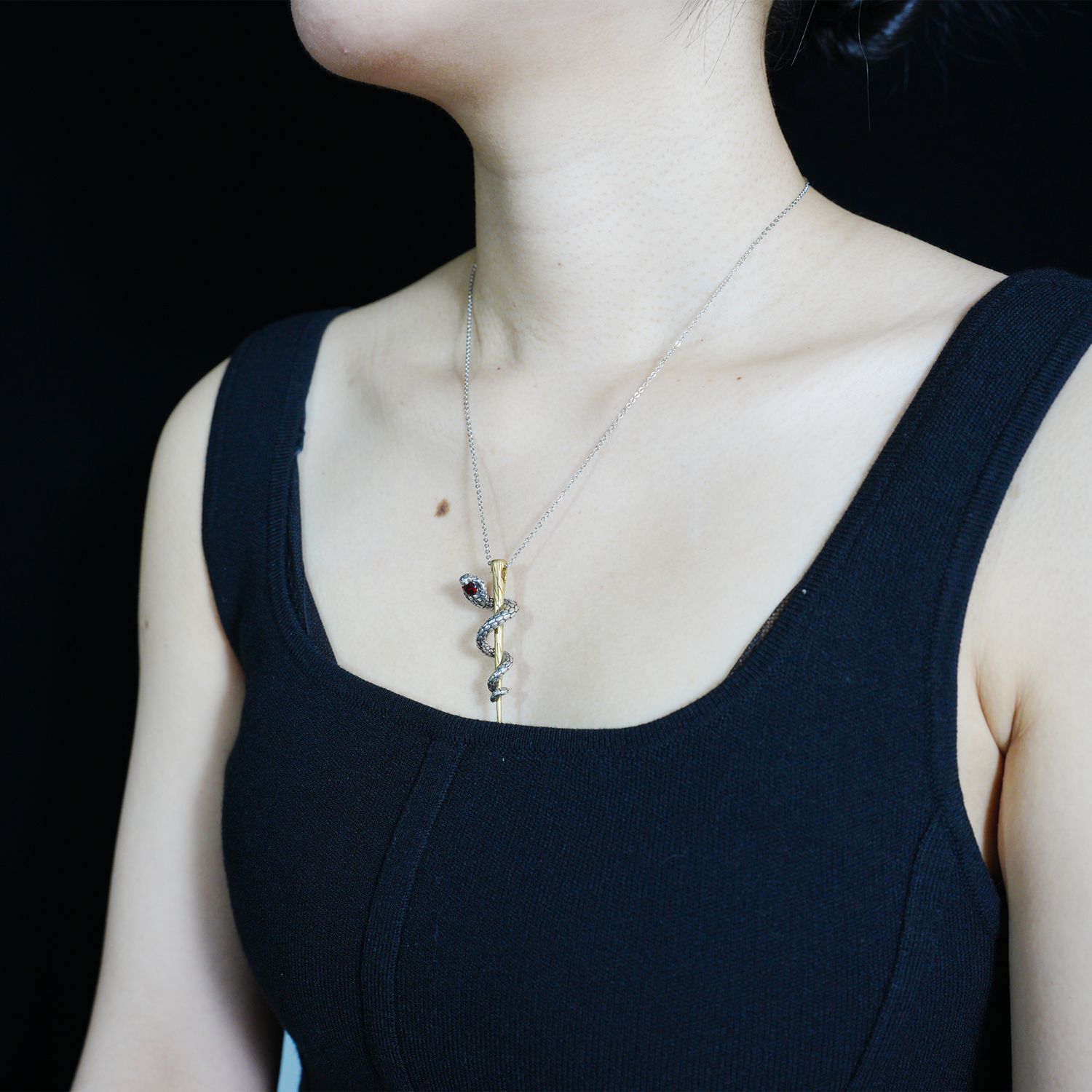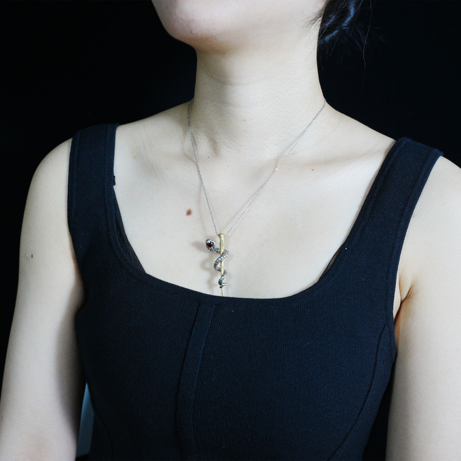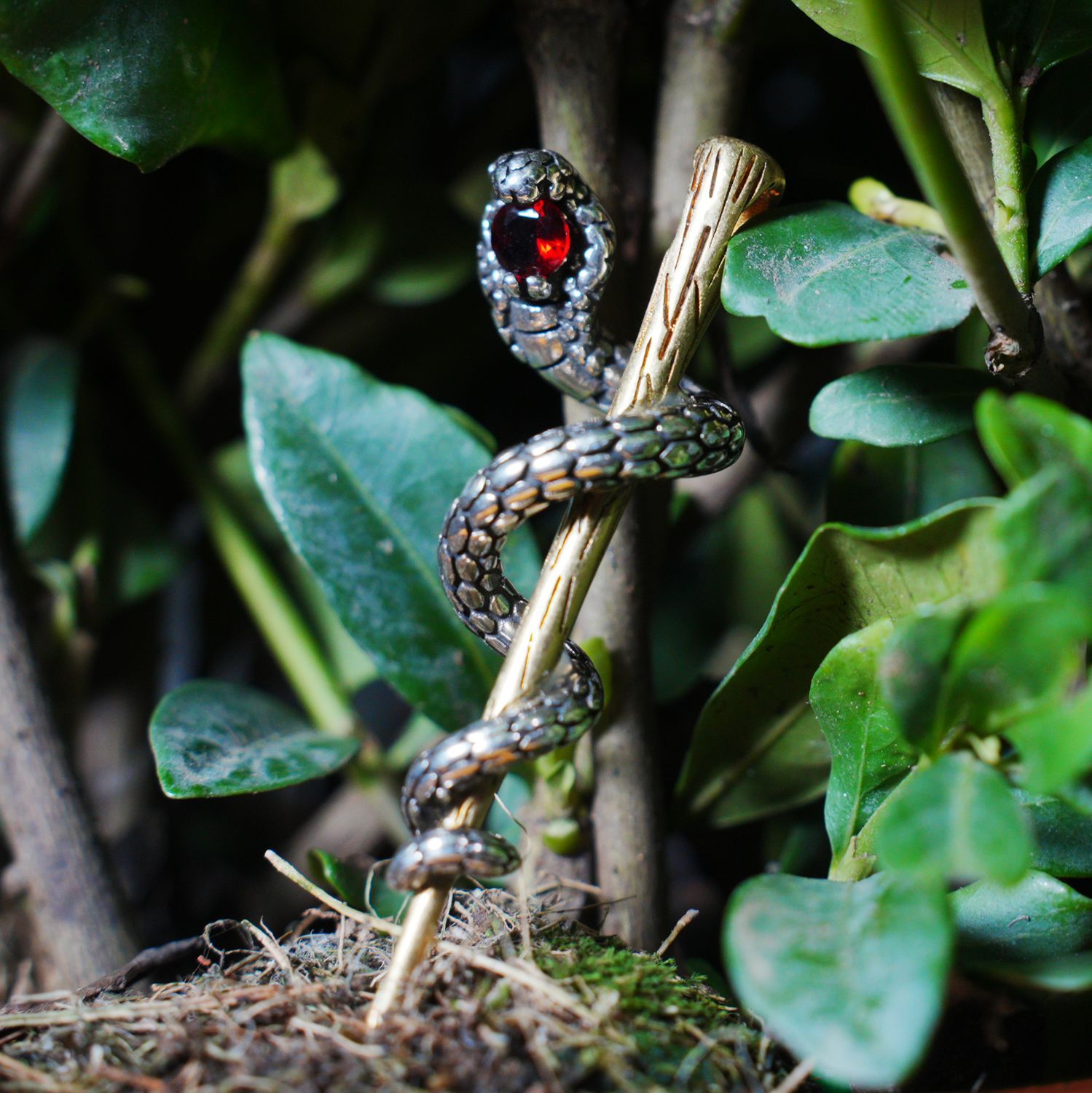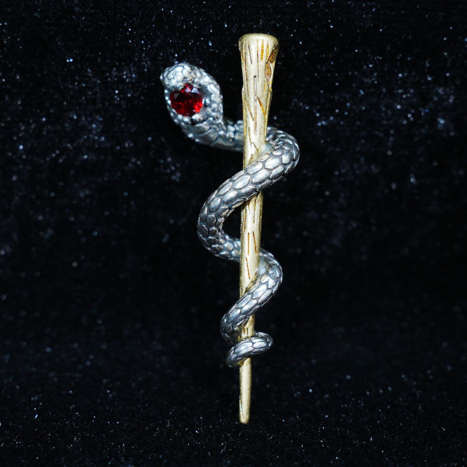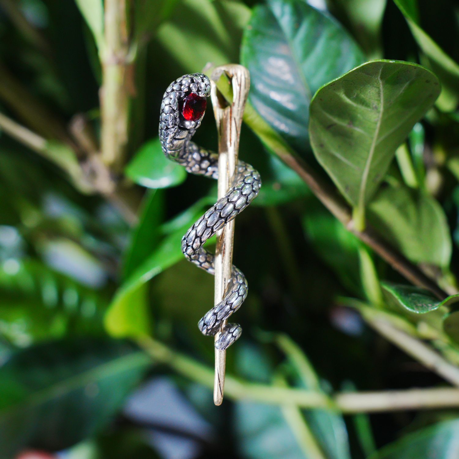 Awakening Serpent Pendant – Wand-Shaped Snake Necklace with Red Gem Eye | Gothic Tali