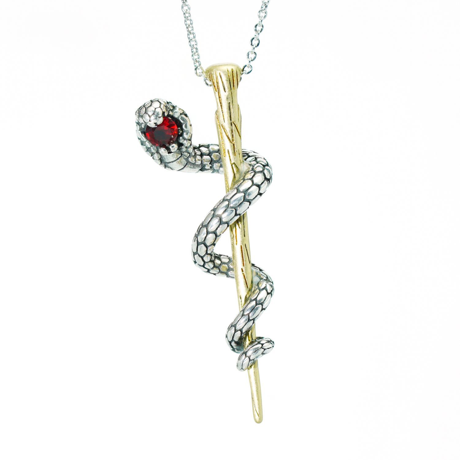 Awakening Serpent Pendant – Wand-Shaped Snake Necklace with Red Gem Eye | Gothic Talisman Jewelry
