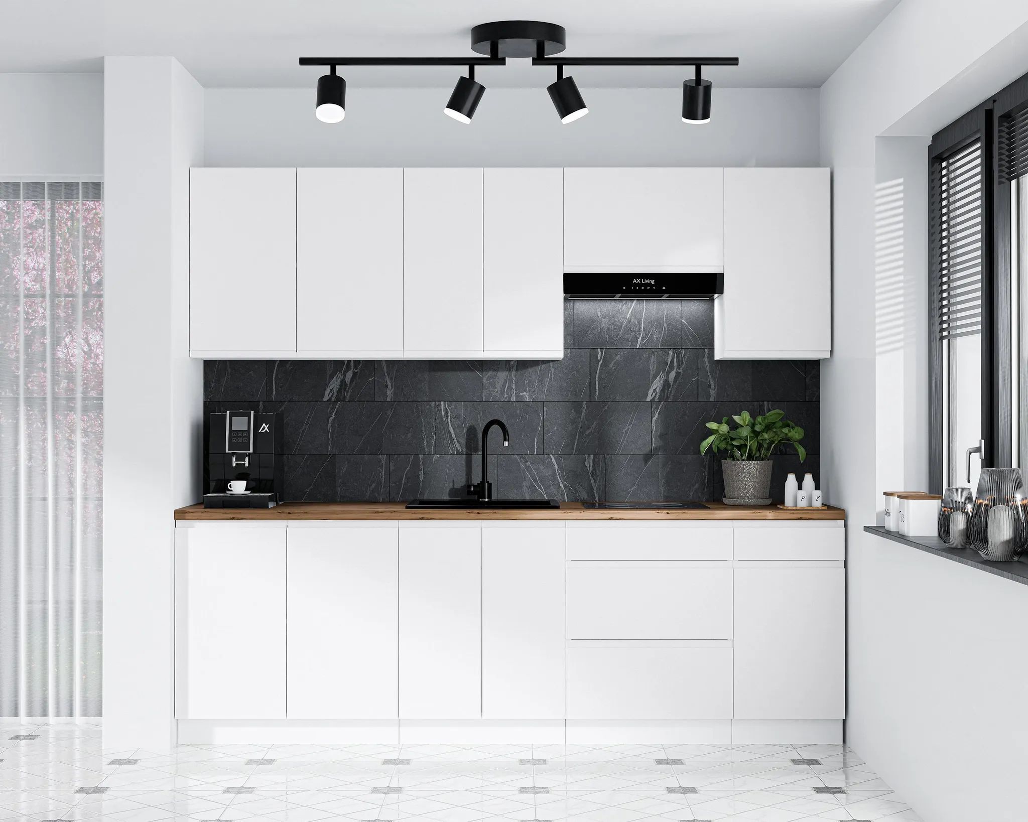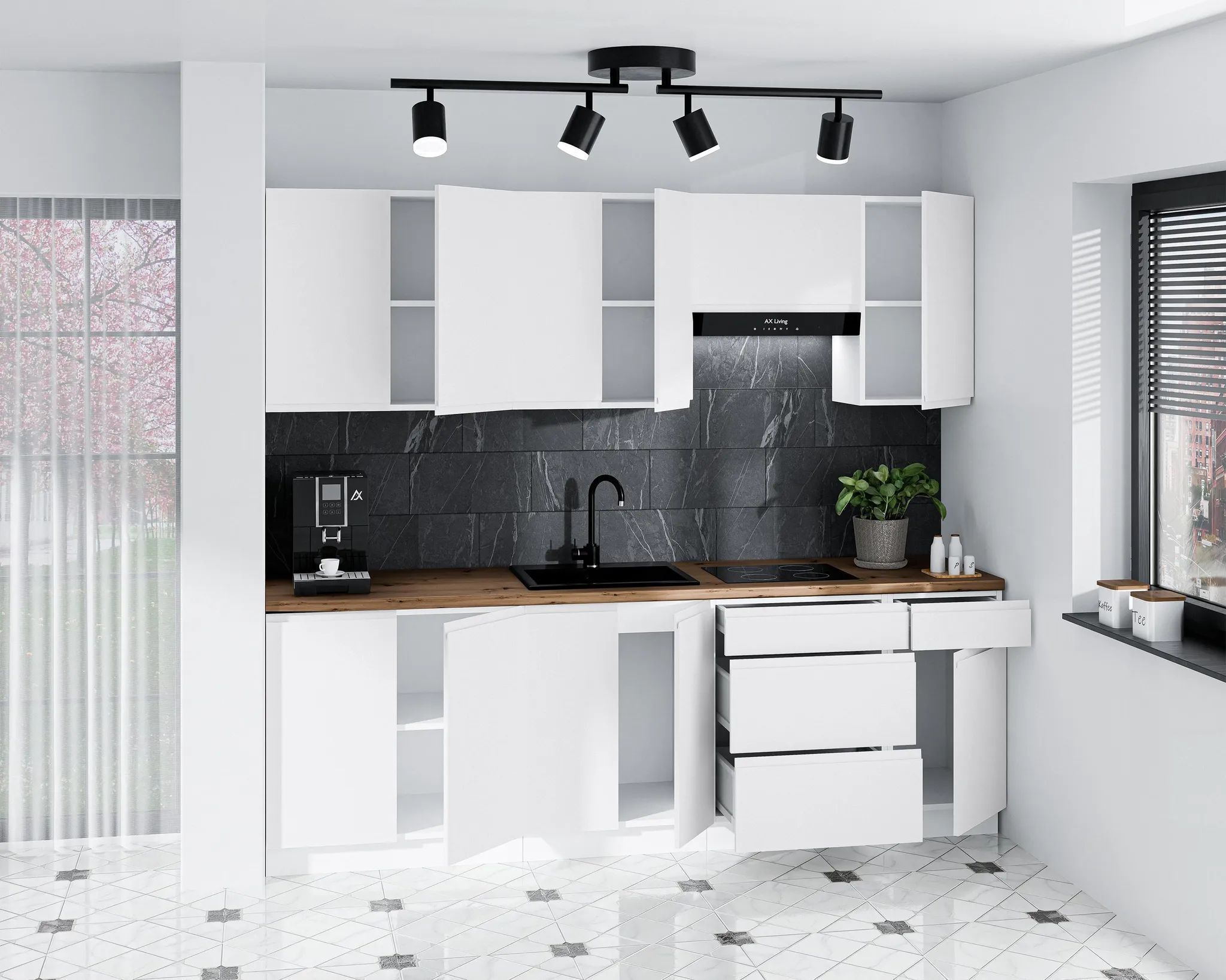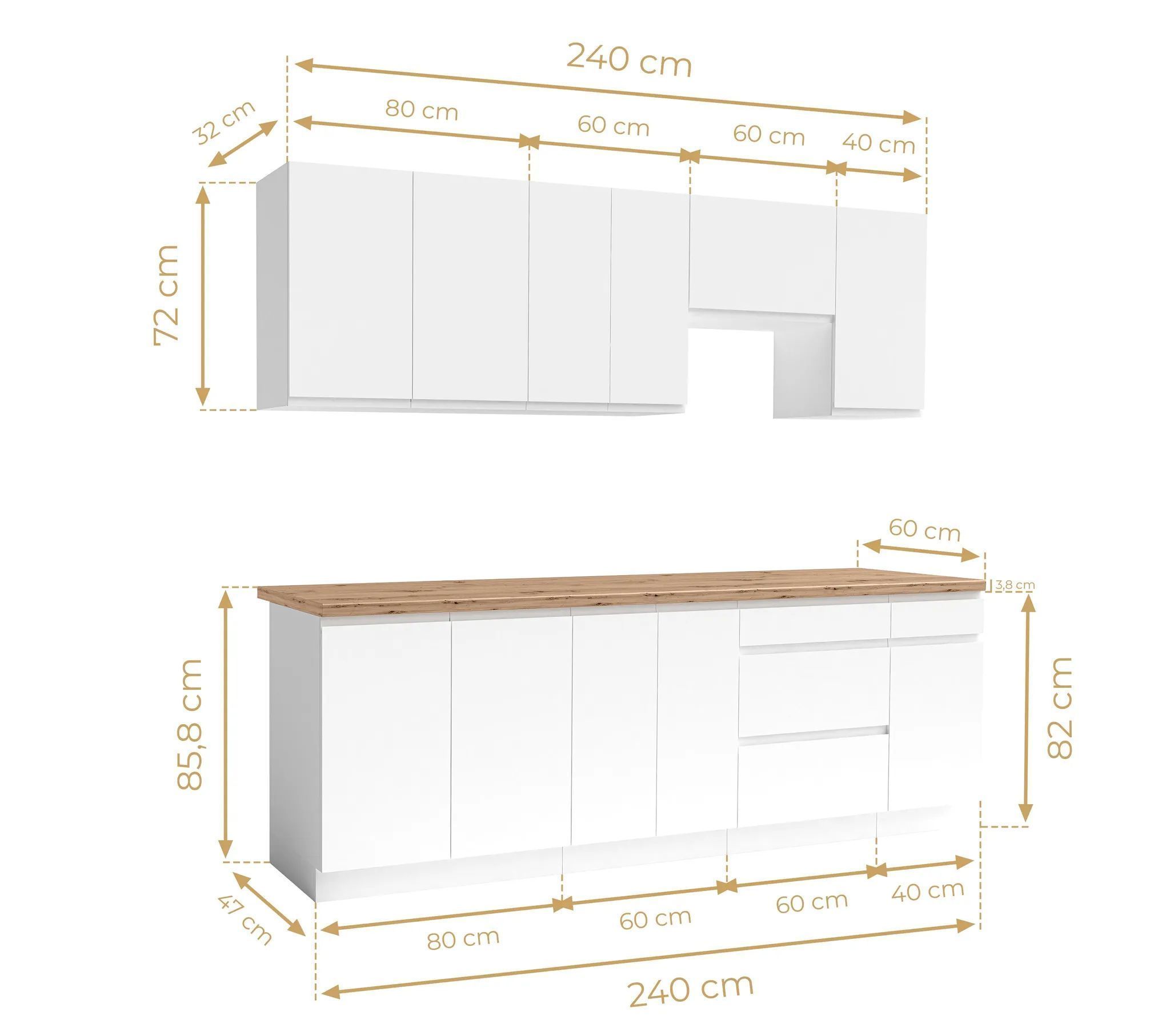 AX LIVING Aquileia Küchenzeile 240 cm - Weiß Matt mit Arbeitsplatte Eiche Artisan