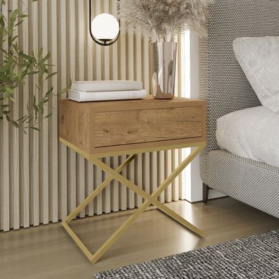 • AX living Nachttisch modern Aleio X - 45 cm breit, Eiche Wotan, goldenes Gestell