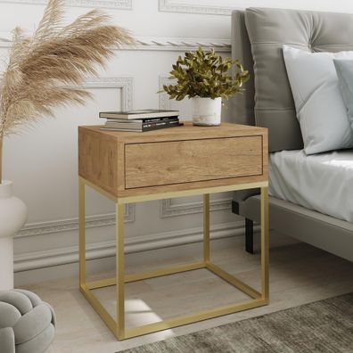 • AX LIVING Nachttisch Kommode Aleio 45 cm Eiche Wotan, goldenes Gestell