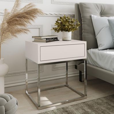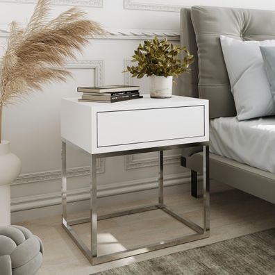 • AX LIVING Nachttisch Kommode Aleio Weiß, verchromtes Metallgestell 45