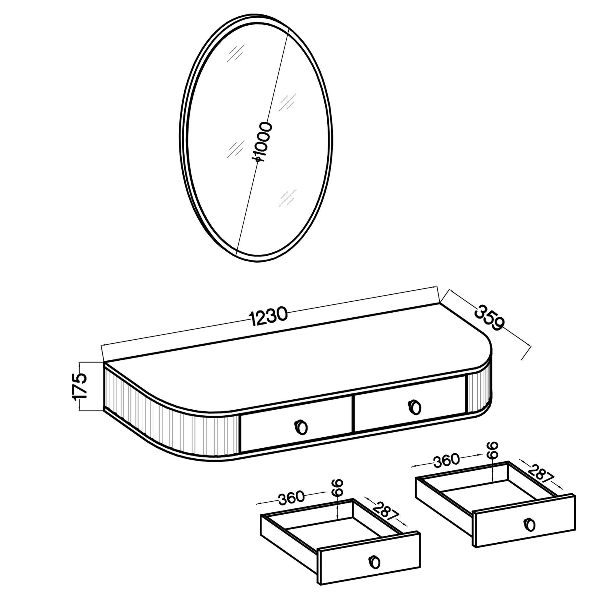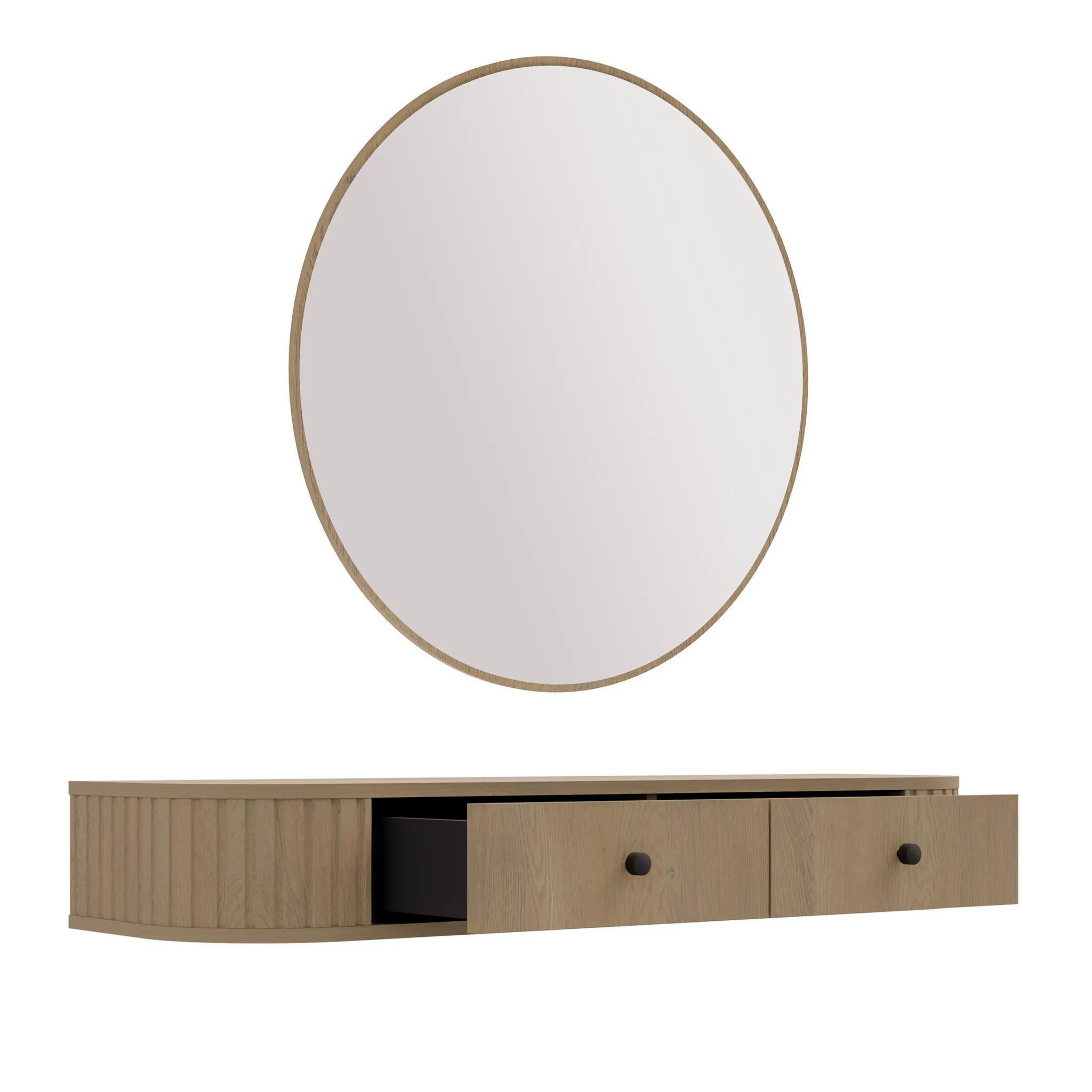 AX LIVING Schminktisch Halay Eiche Cremona 2 Schubladen + Rund Spiegel 100 cm