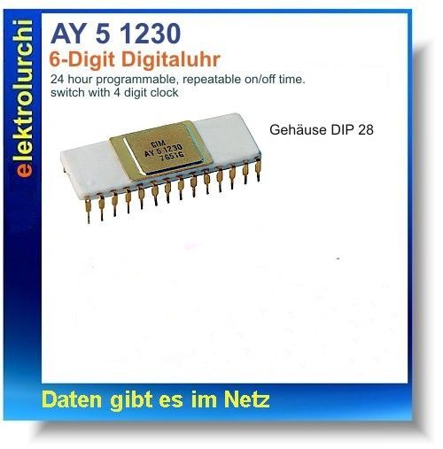 Sie bieten hier auf folgenden Artikel 1 Stück AY-5-1230 - 6-Digit Digitaluhr, IC DIP28, Keramik General Instruments 24 hour programmable, repeatable on off time. Switch with 4-digit clock 24 Stunden programmierbare, wiederholbare Ein- Ausschaltzeit. Schalter für 4-stellige Anzeige