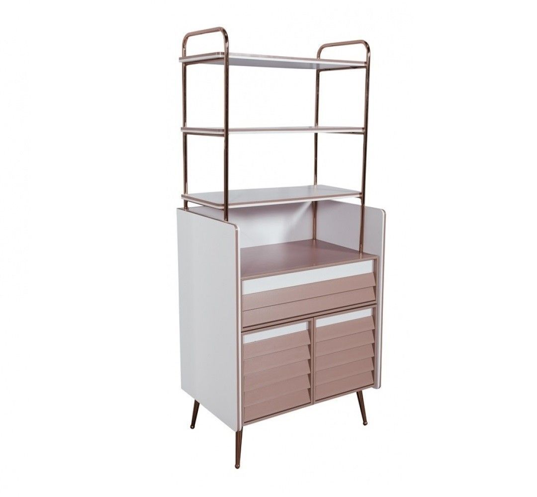 Bücherregal Rosee altrosa weiss RE-BR Im Angebot enthalten: 1x Bücherregal Rosee B H T: ca. 69x163x49 cm MDF-Platte Abgerundete Kanten 1x Schubfach Mit Softclose Mechanismus 2x Türen 3x Regalböden 4x Fuß Füße und Gestell in Rosé metallic Produktinformationen: Front Oberfläche: Melaminbeschich