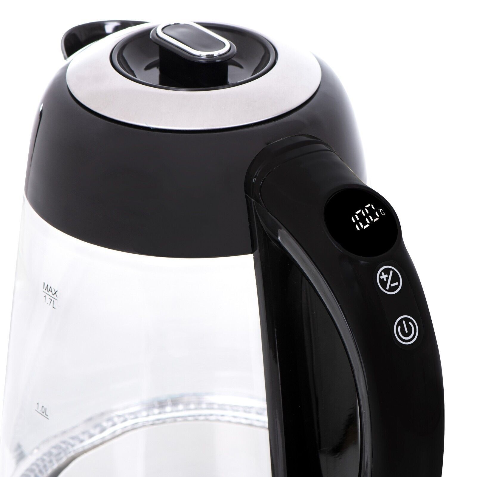 Euro Edle Glas & Edelstahl Optik, Maximale Leistung 2200W, Fassungsvermögen: 1,7L, Temperaturregelung 60-100°C im Griff integriert, Temperaturhaltefunktion für 2 Std. Euro Chlorentfernungsfunktion in 3 Minuten & Antikalk-Filter, Kunststoffteile BPA-Frei Euro LED-Beleuchtung Farbwechsel der I