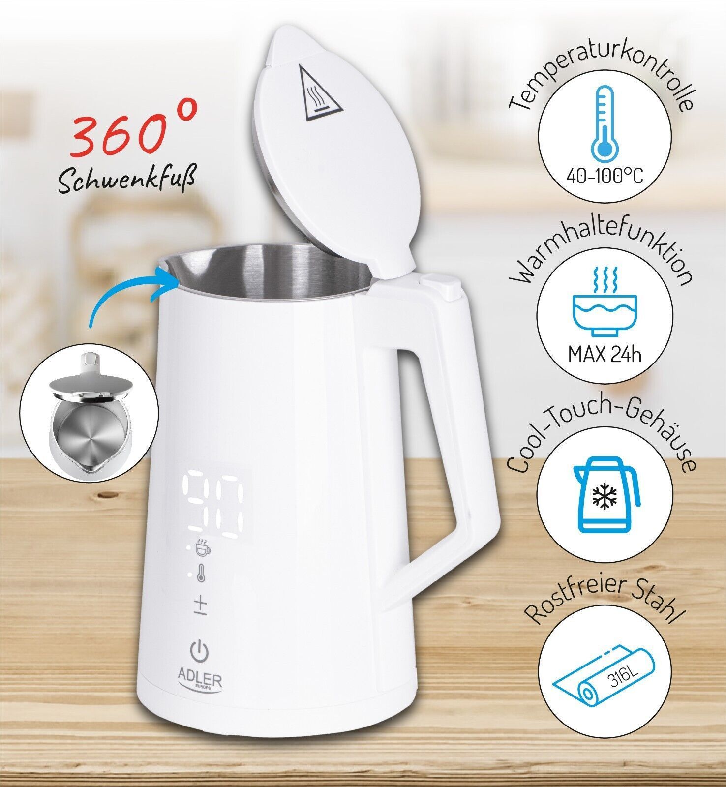 Euro Edelstahl Wasserkocher, Fassungsvermögen: 1,7L, Temperaturregelung 40-100°C am Gerät integriert, Temperaturhaltefunktion für 24 Std. Euro Sedimentfilter & Antikalk-Filter, Kunststoffteile BPA-Frei, Signalton beim einschalten und aufkochen, Abnehmbarer Deckel Euro Wasserstandsanzeige, Kabela