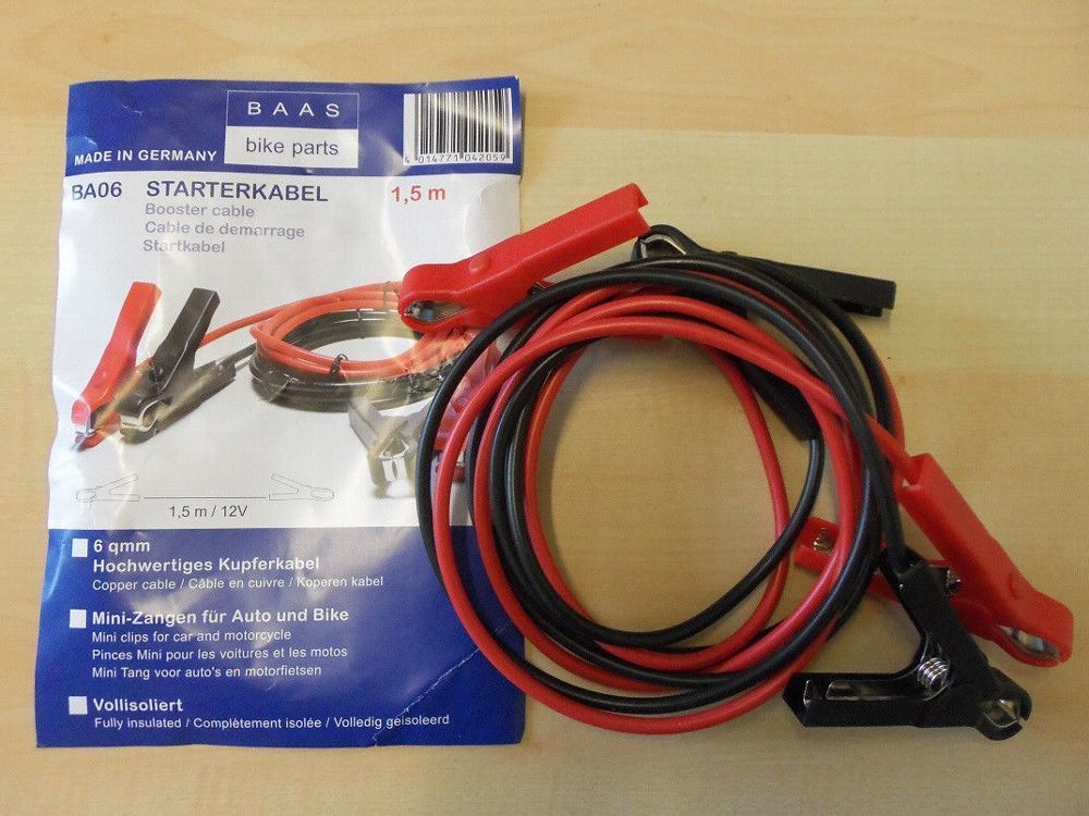 Racing Team verkauft BAAS Starterkabel zur Starthilfe Überbrückung speziell für Motorräder bis maximal ca 1400 ccm . Mit kleinen, vollisolierten Zangen, ideal für schwerzugängliche Motorradbatterien , hochwertiges Kupferkabel ( 6qmm ) Belastbarkeit 50 A , kurzzeitig für max 30 sec 100 A . Vor Gebrau
