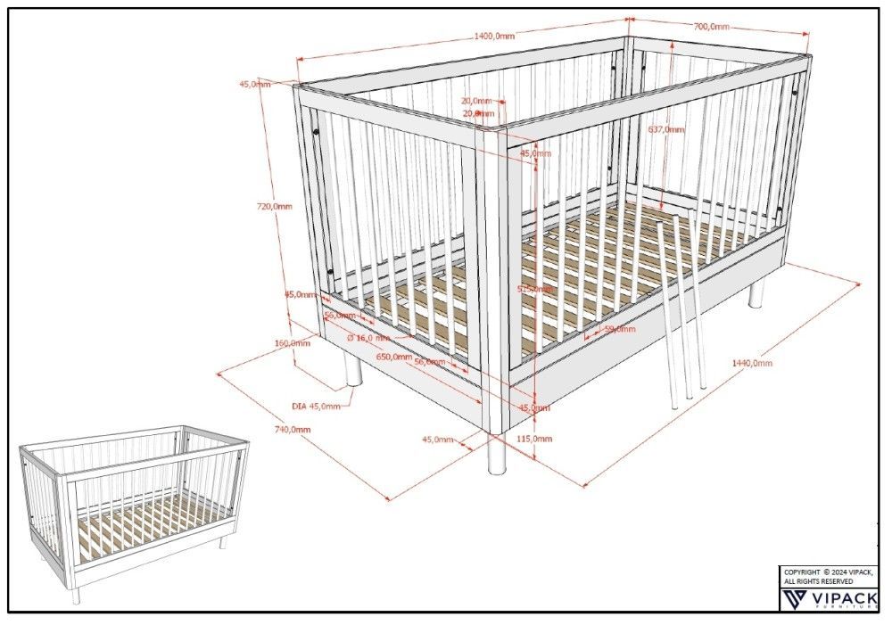VIPACK Babybett Kinderbett Gitterbett Juniorbett 70x140 Eiche massiv natur geölt