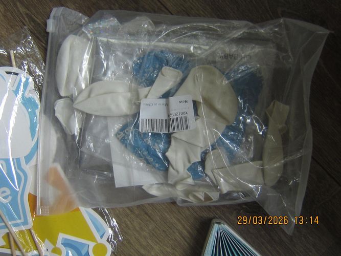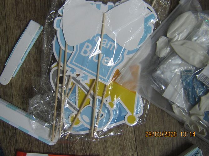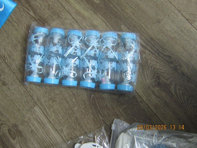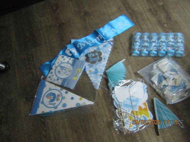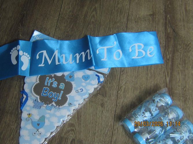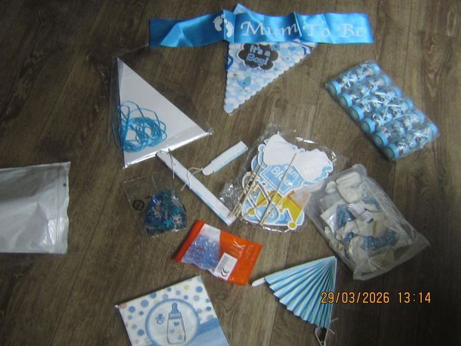 Alles was man für eine Babyparty braucht wenn es ein Junge wird .Babyfläschen ,Wimpeln ,Luftballons ,Scherpe usw. Fächer und viel Glitzer