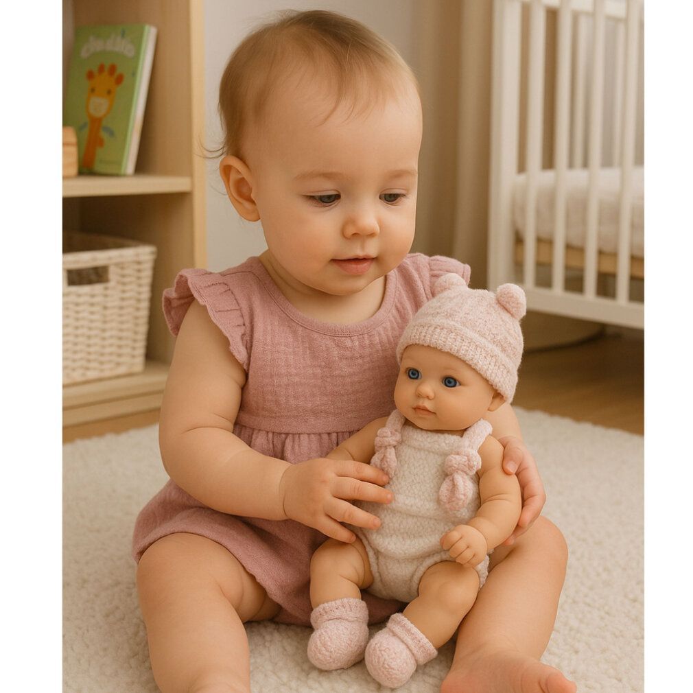 Babypuppe, rosa Outfit, Mütze, Lätzchen, 18 cm