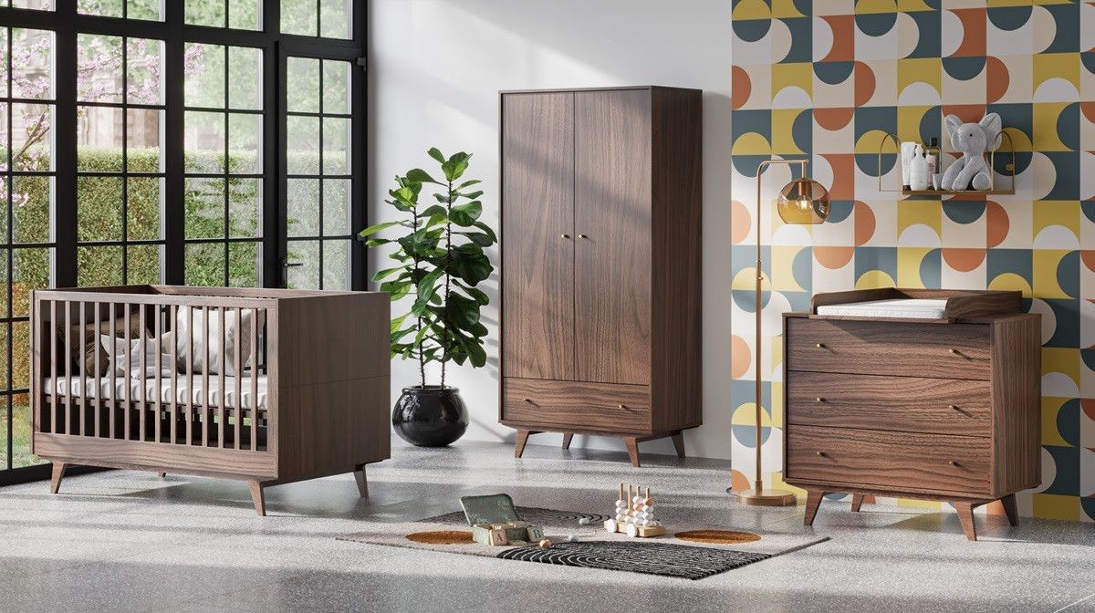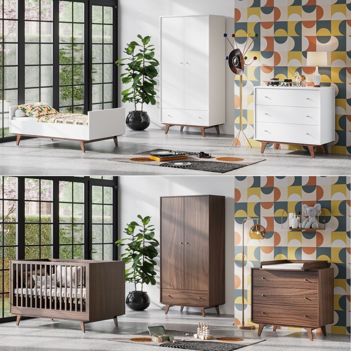 Babyzimmer komplett Set Bonny Lieferumfang: Zum 4-tg Babyzimmer gehören: 1. Schrank 2-türig 2. Kommode mit 3 Schubladen 3. Wickelansatz 4. Babybett 140x70 + Juniorbett-Umbausatz Farbe: - Fronten und Korpus: Weiß Gestell mit Füßen: Walnuss Griffe: Gold - Fronten, Korpus, Gestell mit Füßen: Walnuss Gr