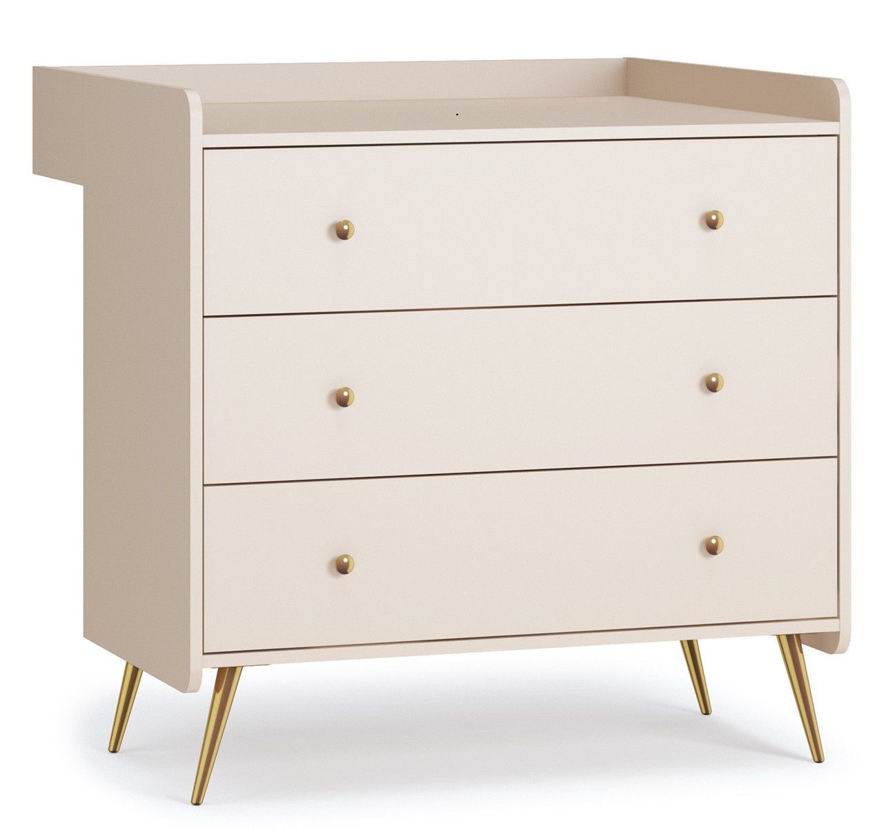 Babyzimmer komplett Set LIEN Zum 4-tg Babyzimmer Set gehören: 1. Schrank 2-türig 2. Kommode mit 3 Schubladen 3. Wickelansatz 4. Babybett 140x70 + Juniorbett-Umbausatz Farbe: - Sandbeige Füße und Griffe: Gold Material: - Laminierte Spanplatte 16mm und 22mm stark mit ABS-Kanten - Lattenrost und Spross
