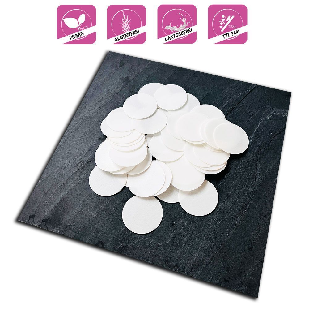 Backoblaten in Rund aus Oblatenpapier Premium in 9cm Durchmesser - 48 Stück Zaubern Sie tolle Backwerke wie zum Beispiel Kokosmakronen oder Lebkuchen mit unseren Backoblaten aus Oblatenpapier Premium. Dieses Papier ist sehr stabil und ca. 1mm stark. Es eignet sich zum Mitbacken. Verwendungsbereiche
