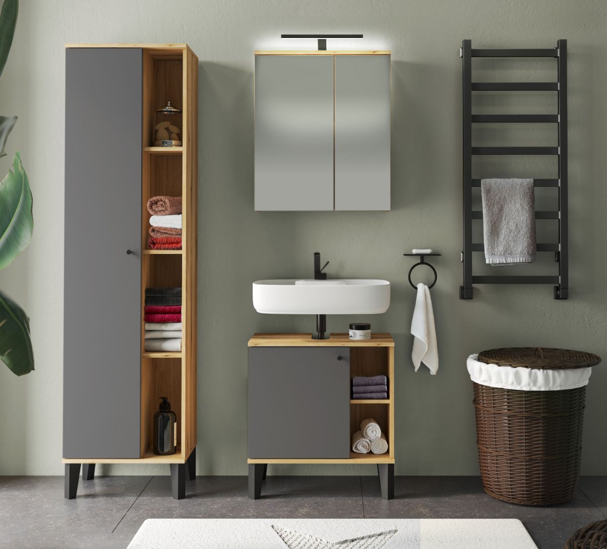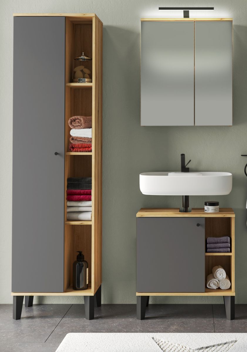 Bad Badezimmer Möbel komplett Set 3-tlg grau Eiche Evoke Spiegelschrank Torsby 121 cm