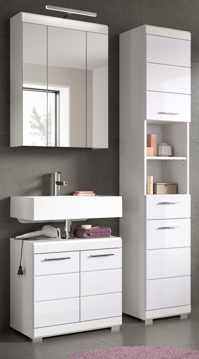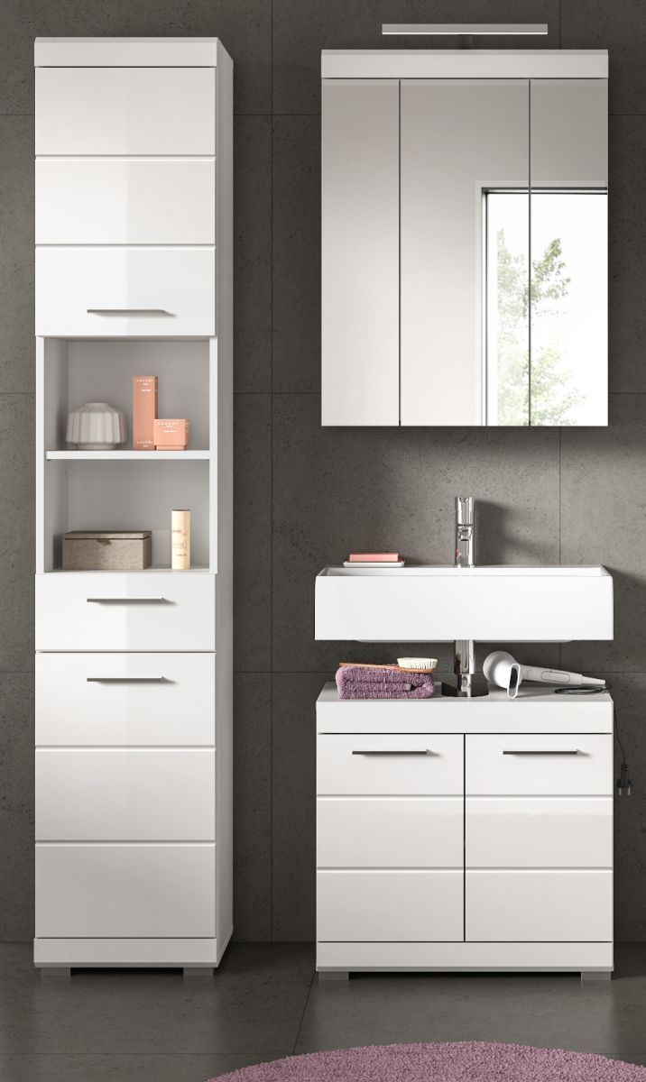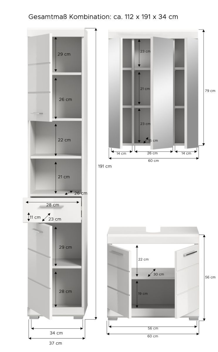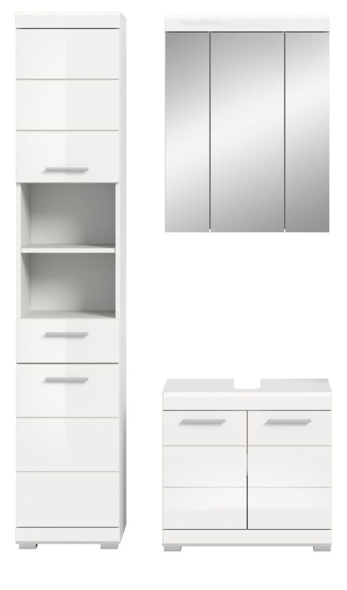 Bad Badezimmer Möbel komplett Set 3-tlg. weiß Hochglanz Badmöbel Shawn 112 x 191 cm