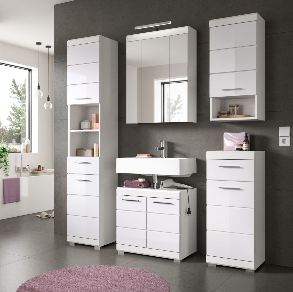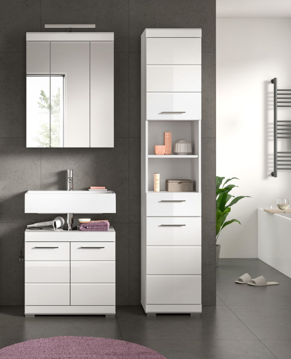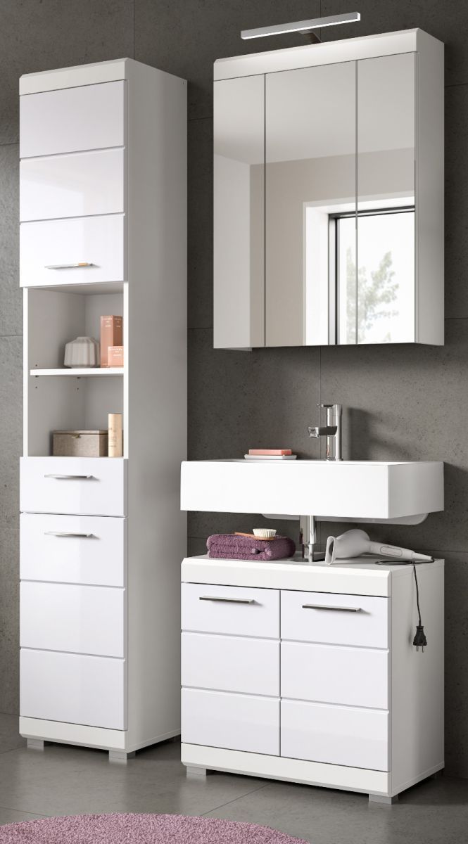 Bad Badezimmer Möbel komplett Set 3-tlg. weiß Hochglanz Badmöbel Shawn 112 x 191 cm