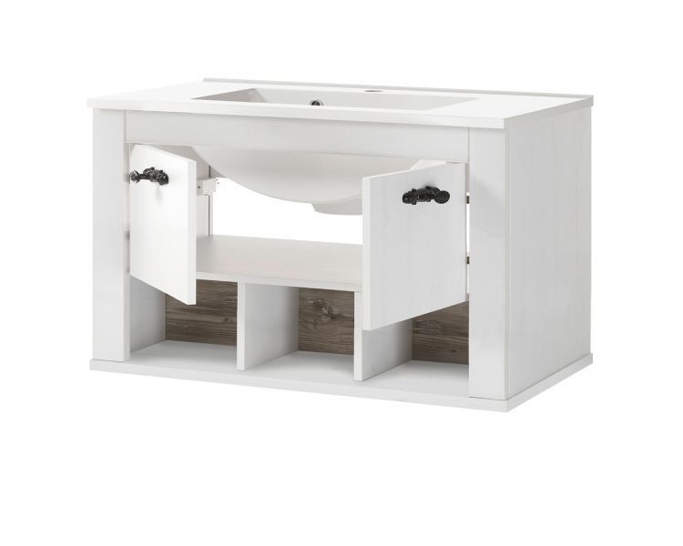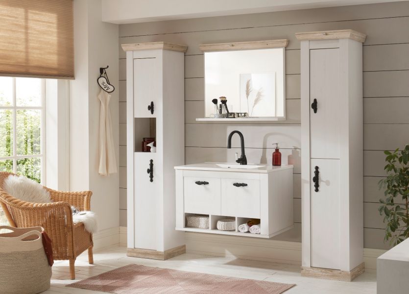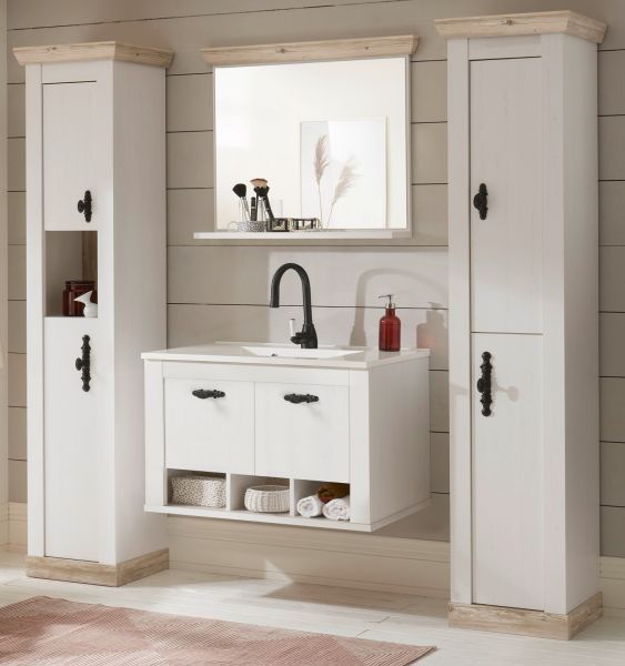 Bad Möbel Badezimmer komplett Set MIT Waschbecken weiß Pinie Waschtisch Rovola