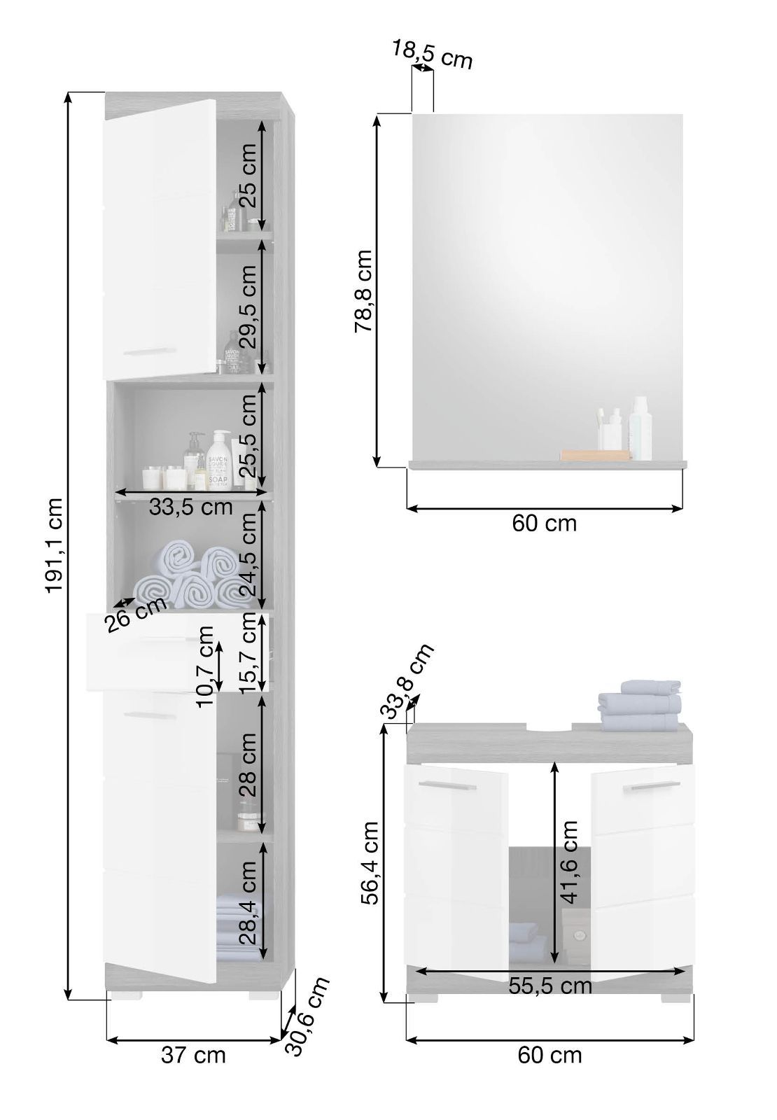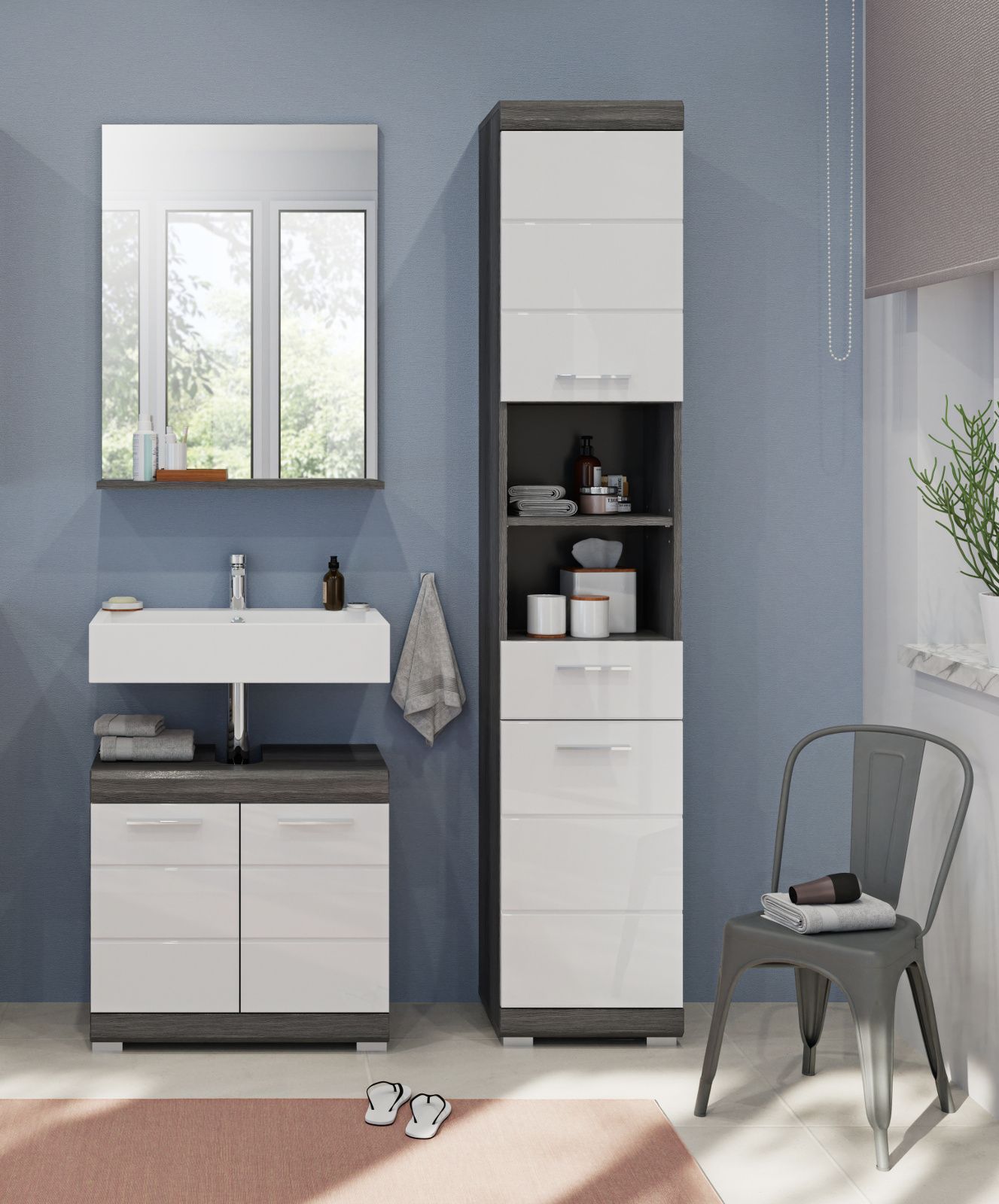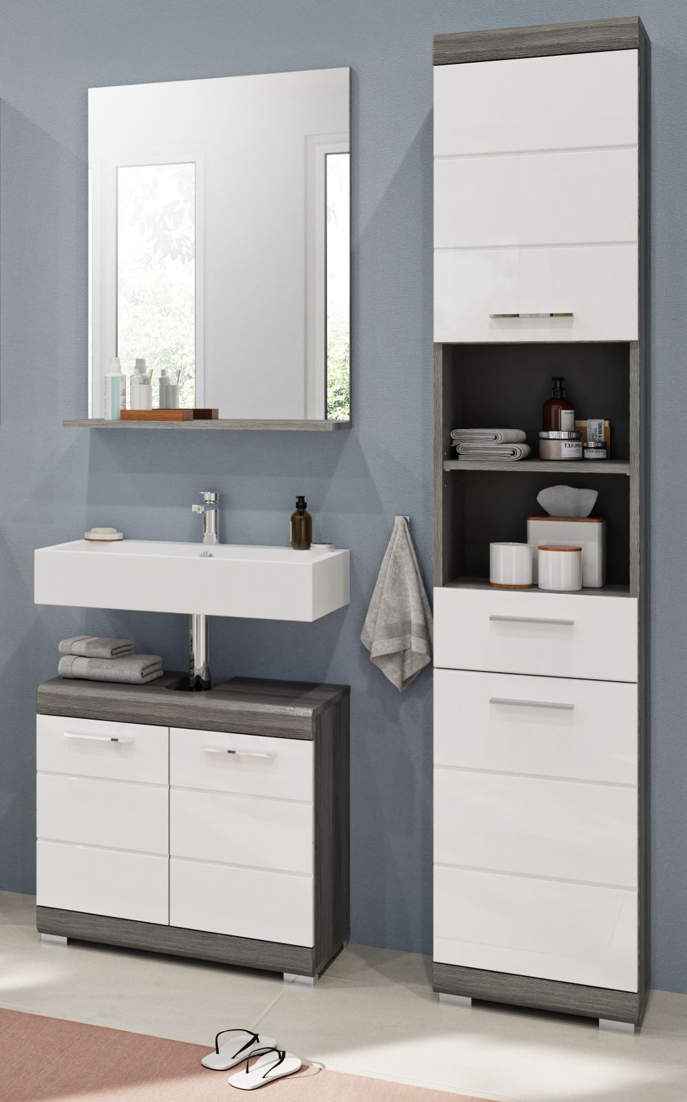 Bad Möbel Set Badezimmer Möbelset weiß Hochglanz 3-teilig mit Hochschrank Shawn