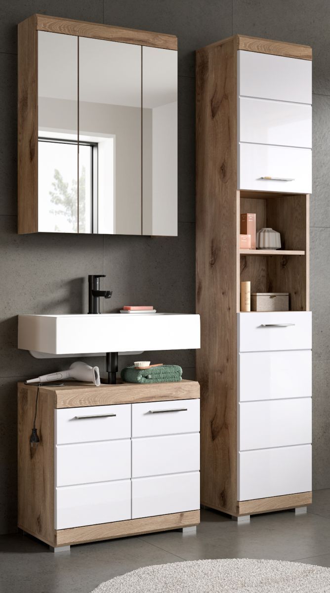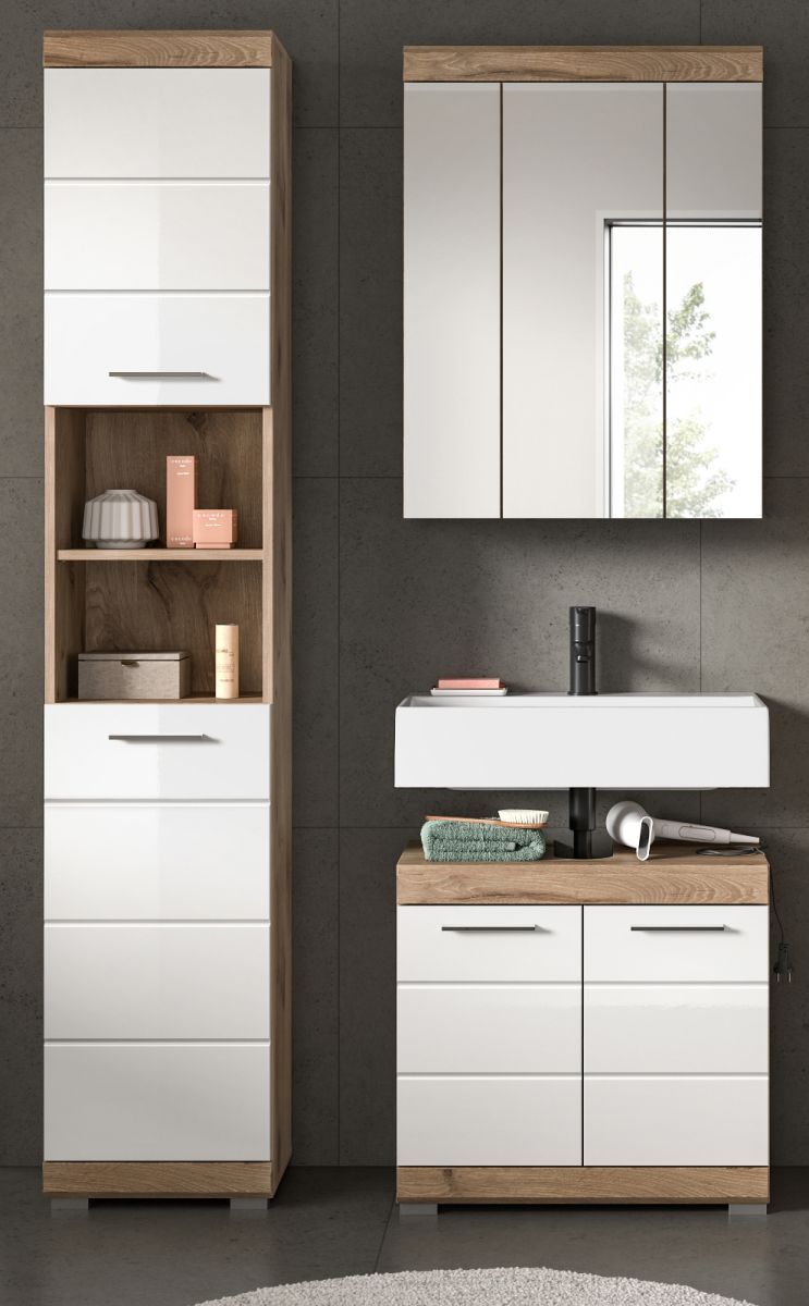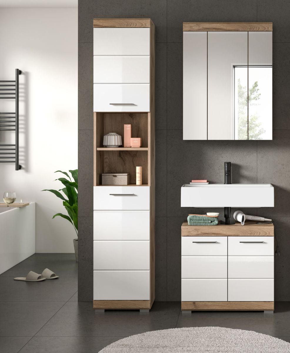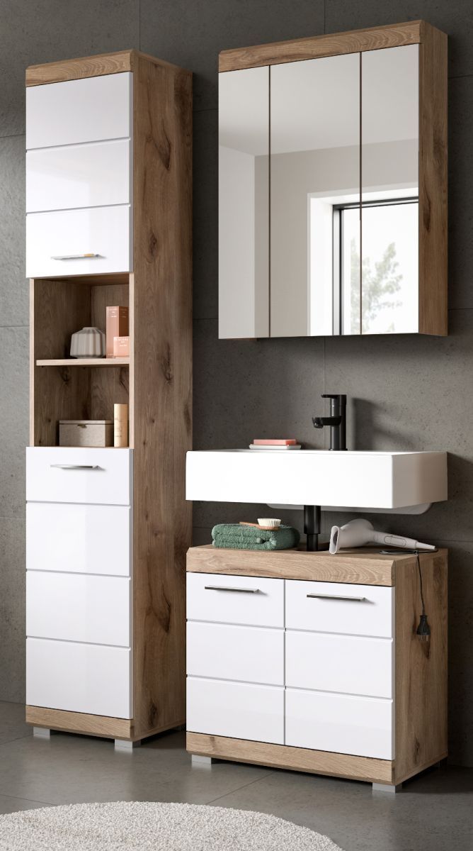 Bad Möbel Set weiß Hochglanz Eiche Badezimmer Badset 3-tlg. mit Hochschrank Willow