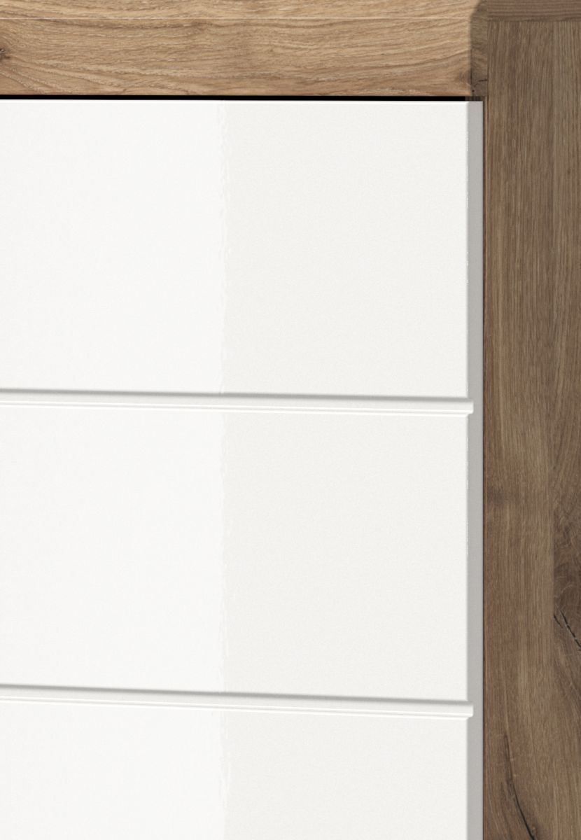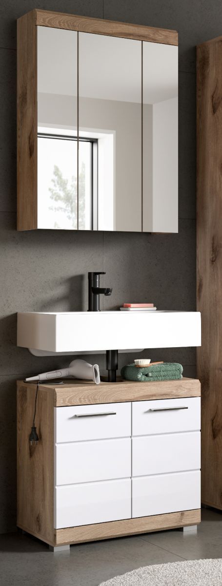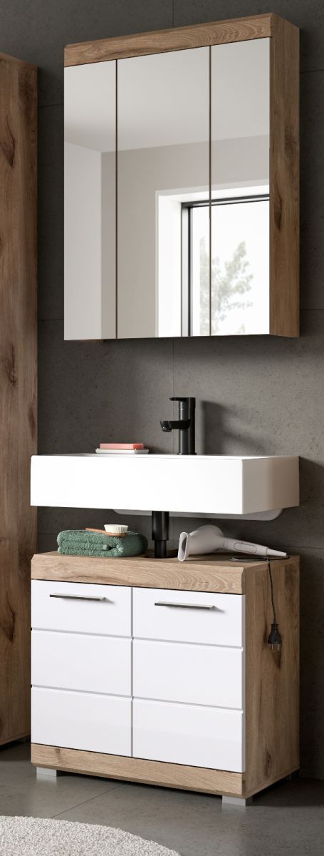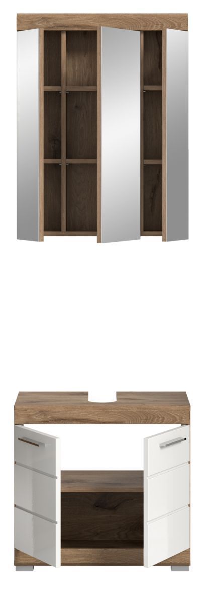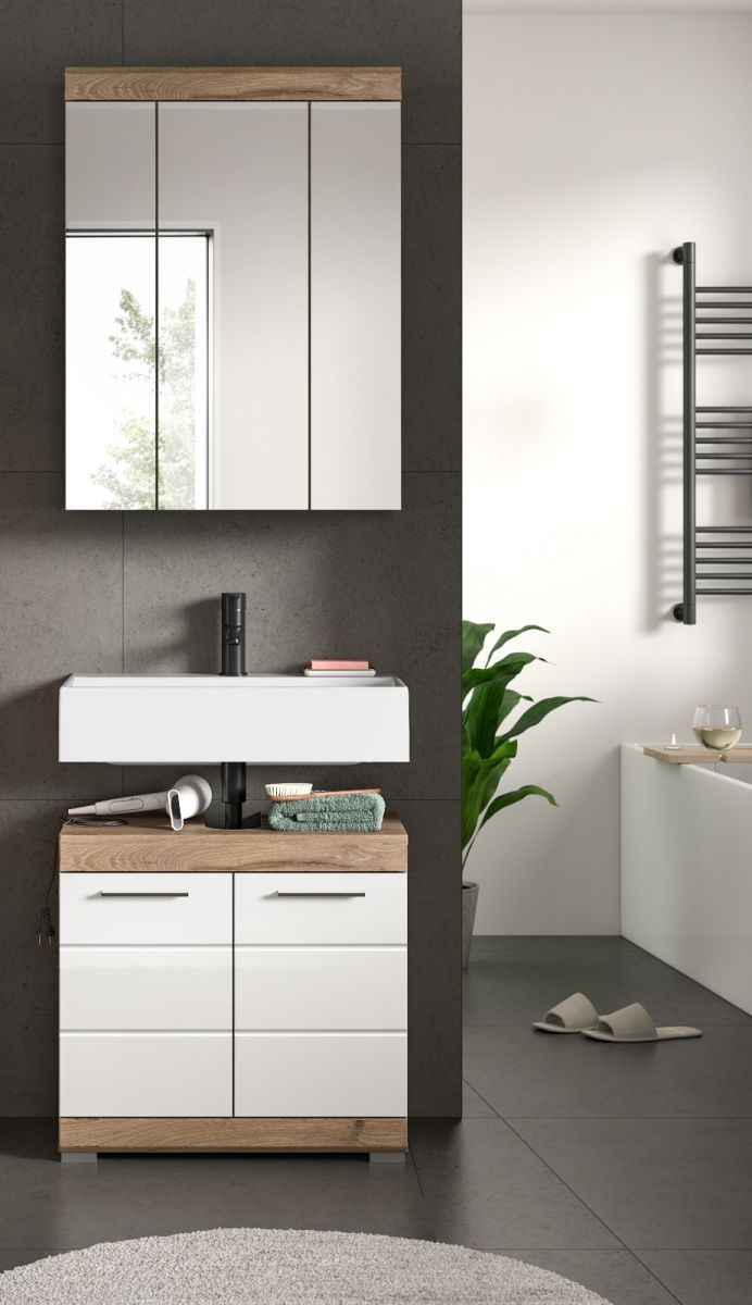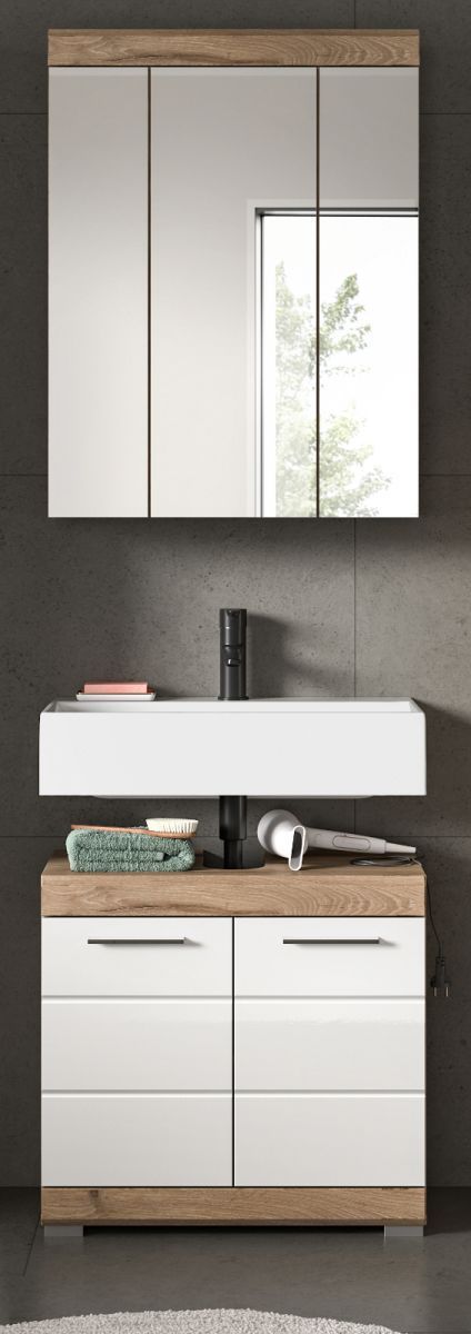 Bad Möbel Set weiß Hochglanz Eiche Badezimmer Unterschrank und Spiegelschrank Willow