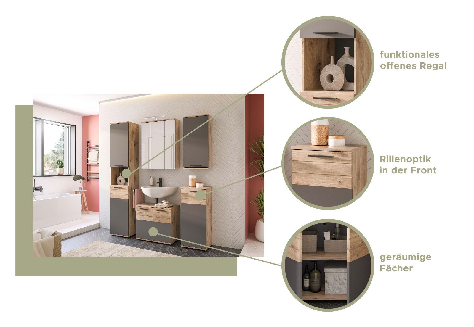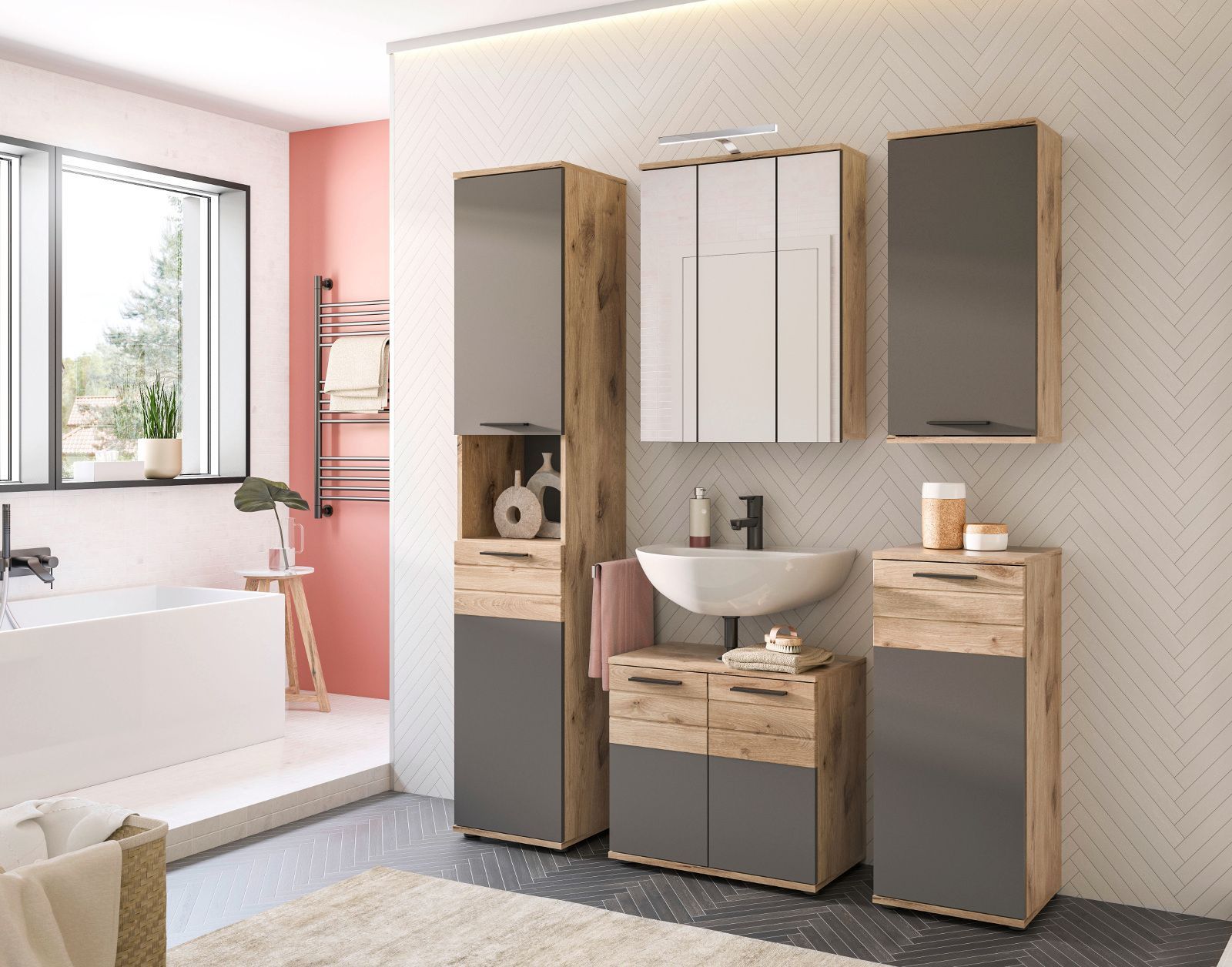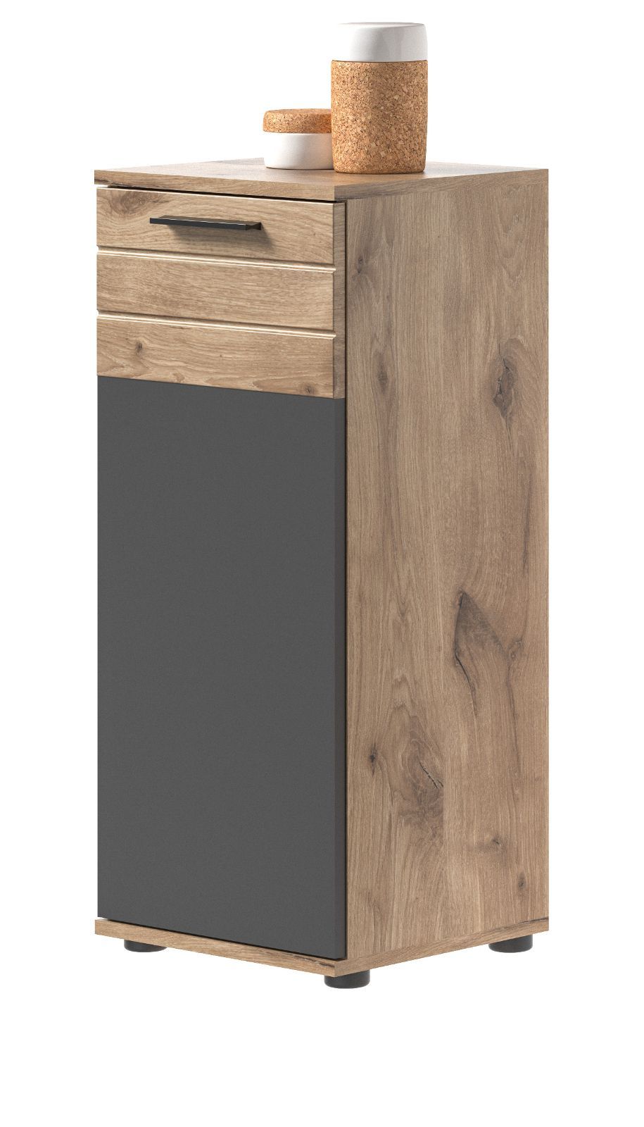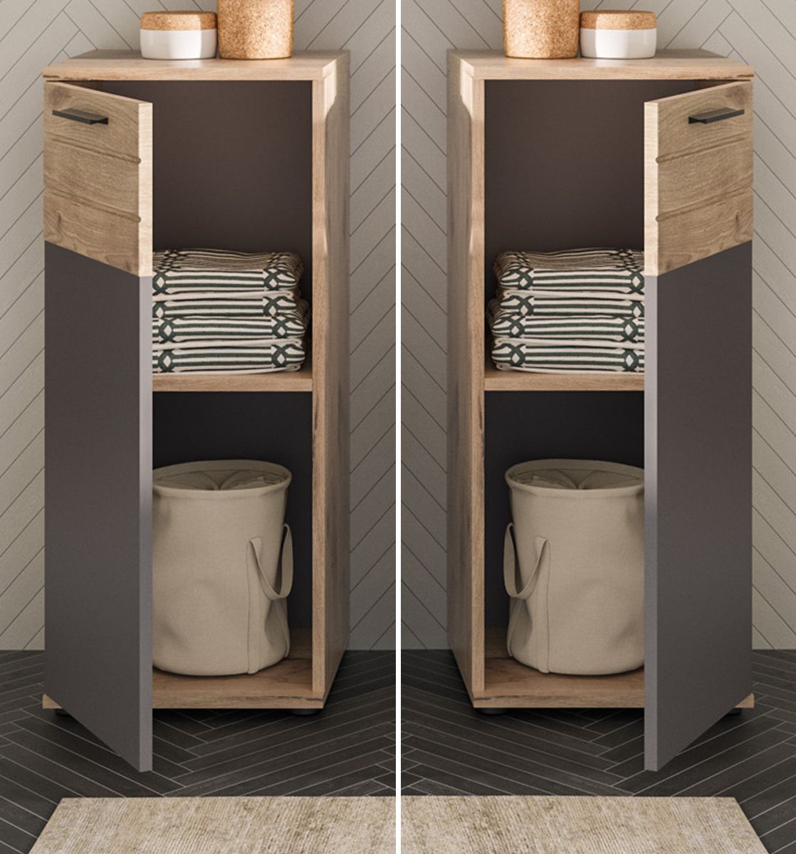 Bad Unterschrank Badschrank Kommode Eiche und grau Badezimmer Soft-Close Tomaso