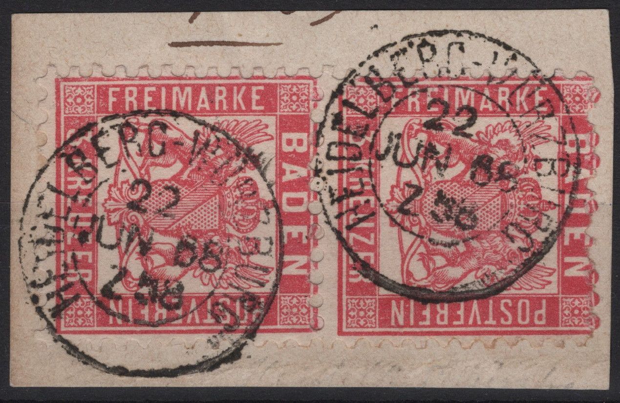 Erhaltung siehe Scans. MiNr. 18 als Paar auf Briefstück. Mit zweifachem Abschlag Bahnpost-Streckenstempel HEIDELBERG-WÜRZBURG.