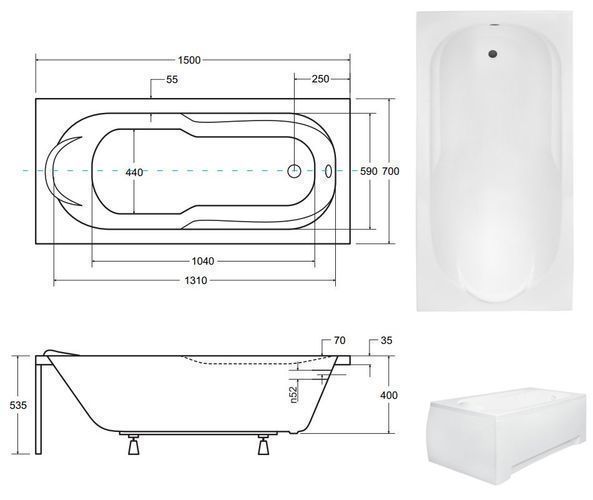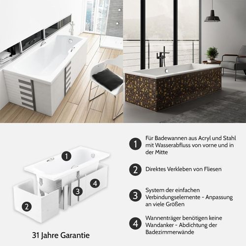 Badewanne Rechteck 150x70 BONA + Wannenträger + Kopfstütze | Ablauf & Füße GRATIS