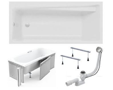 • ECOLAM Badewanne 170x75 Quadro Rechteck Acrylwanne Schürze Ablaufgarnitur Silikon