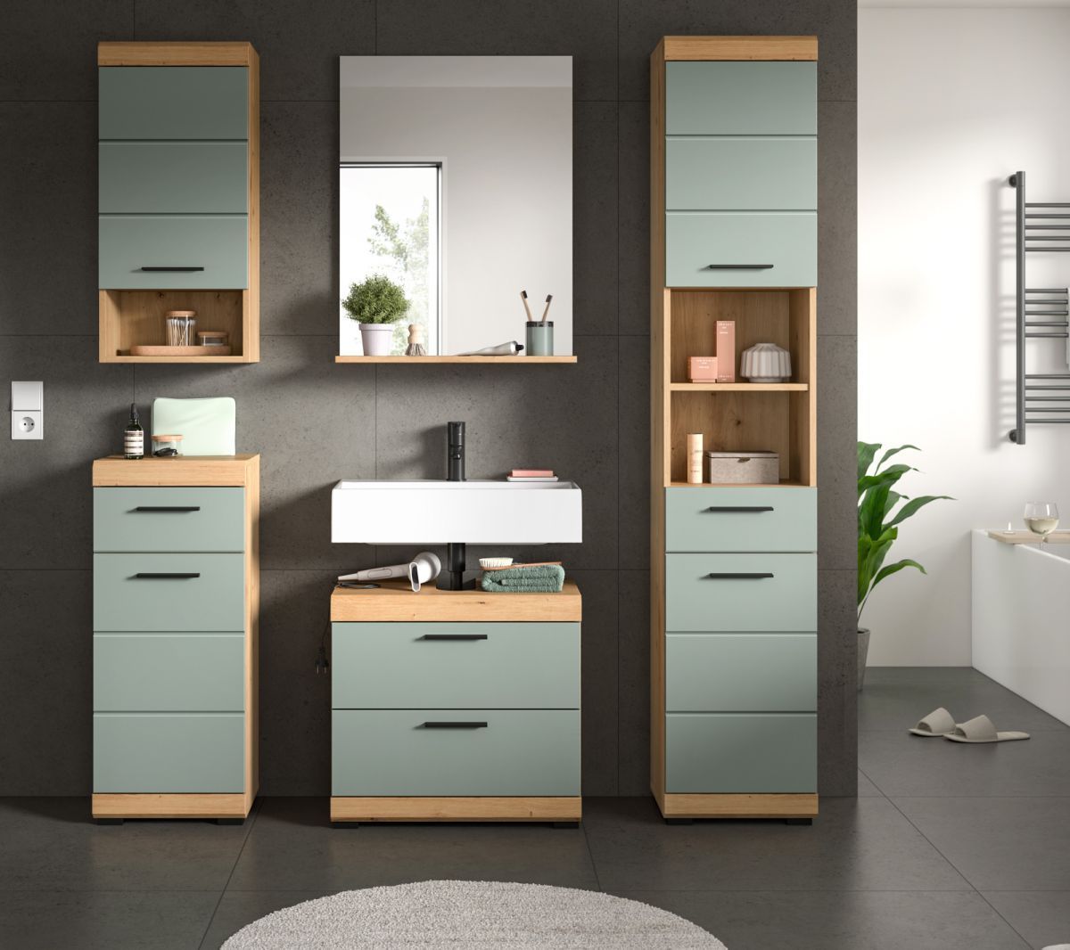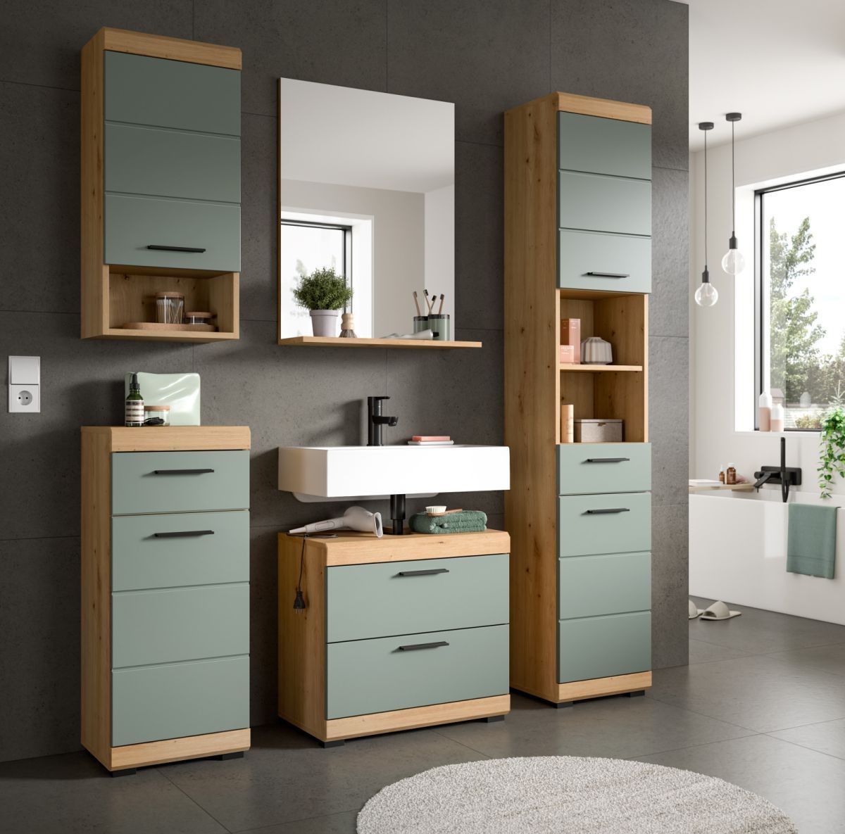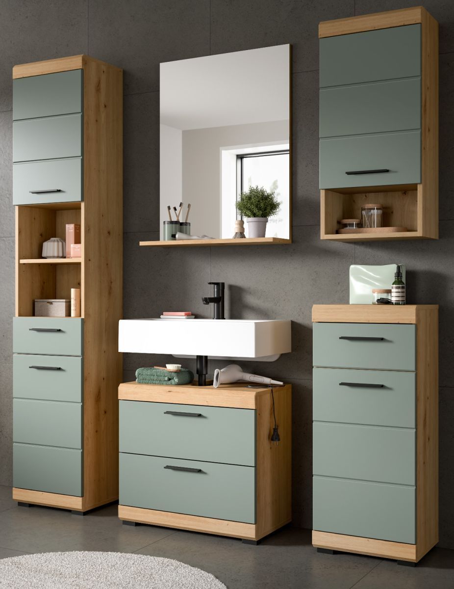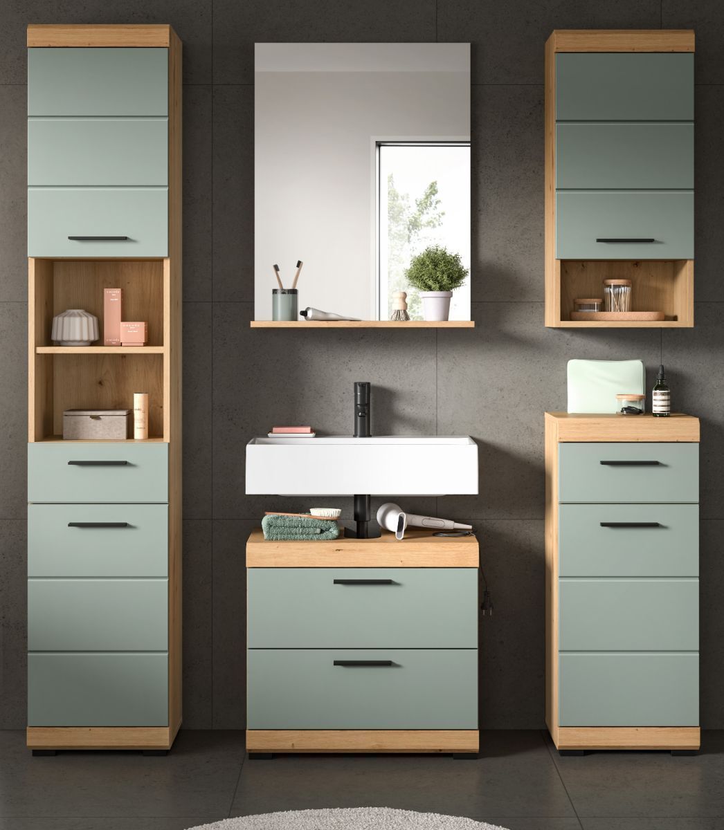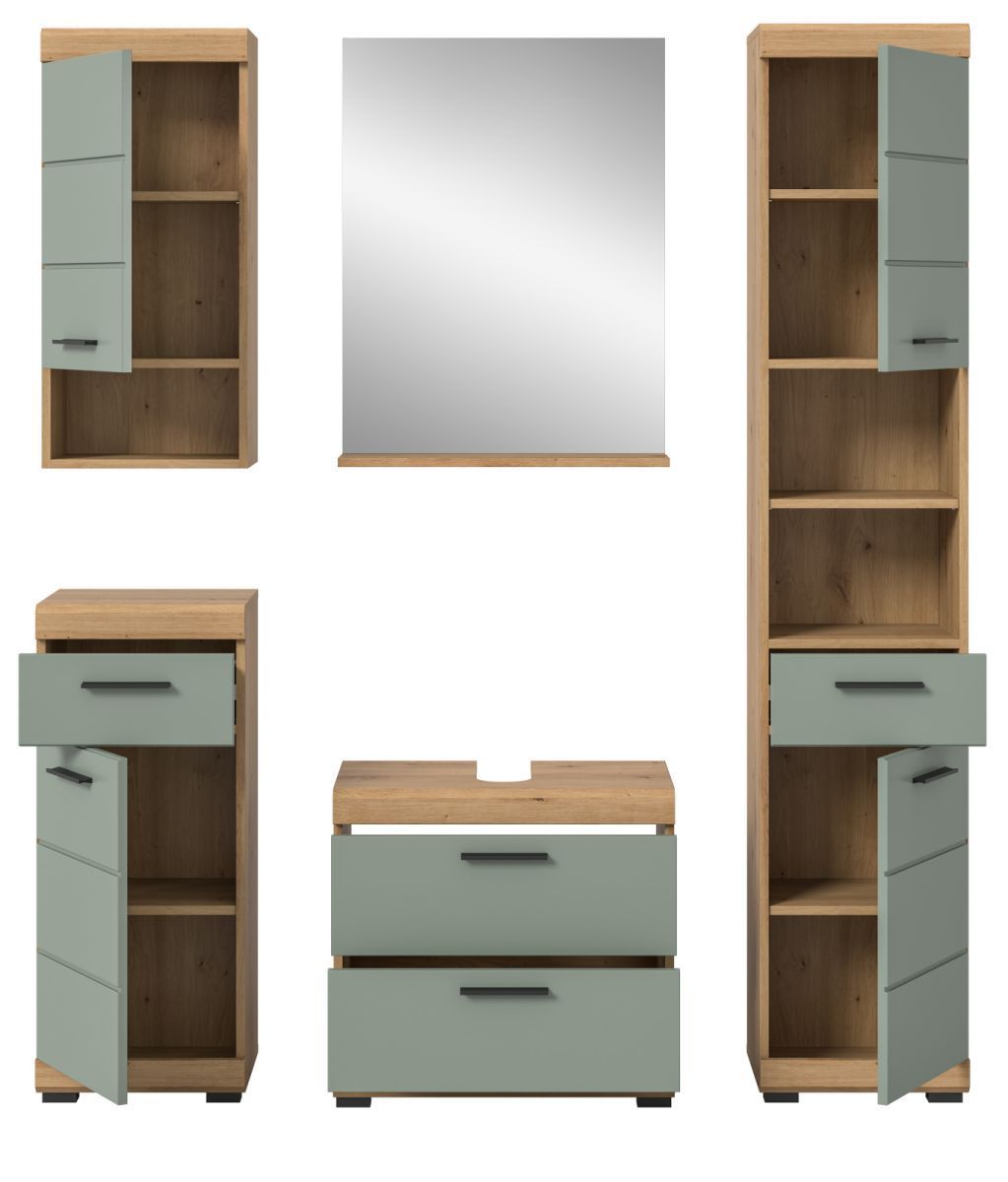 Badezimmer Badmöbel Set 5-tlg. Salbei grün Eiche Bad Einrichtung Hochschrank Shawn