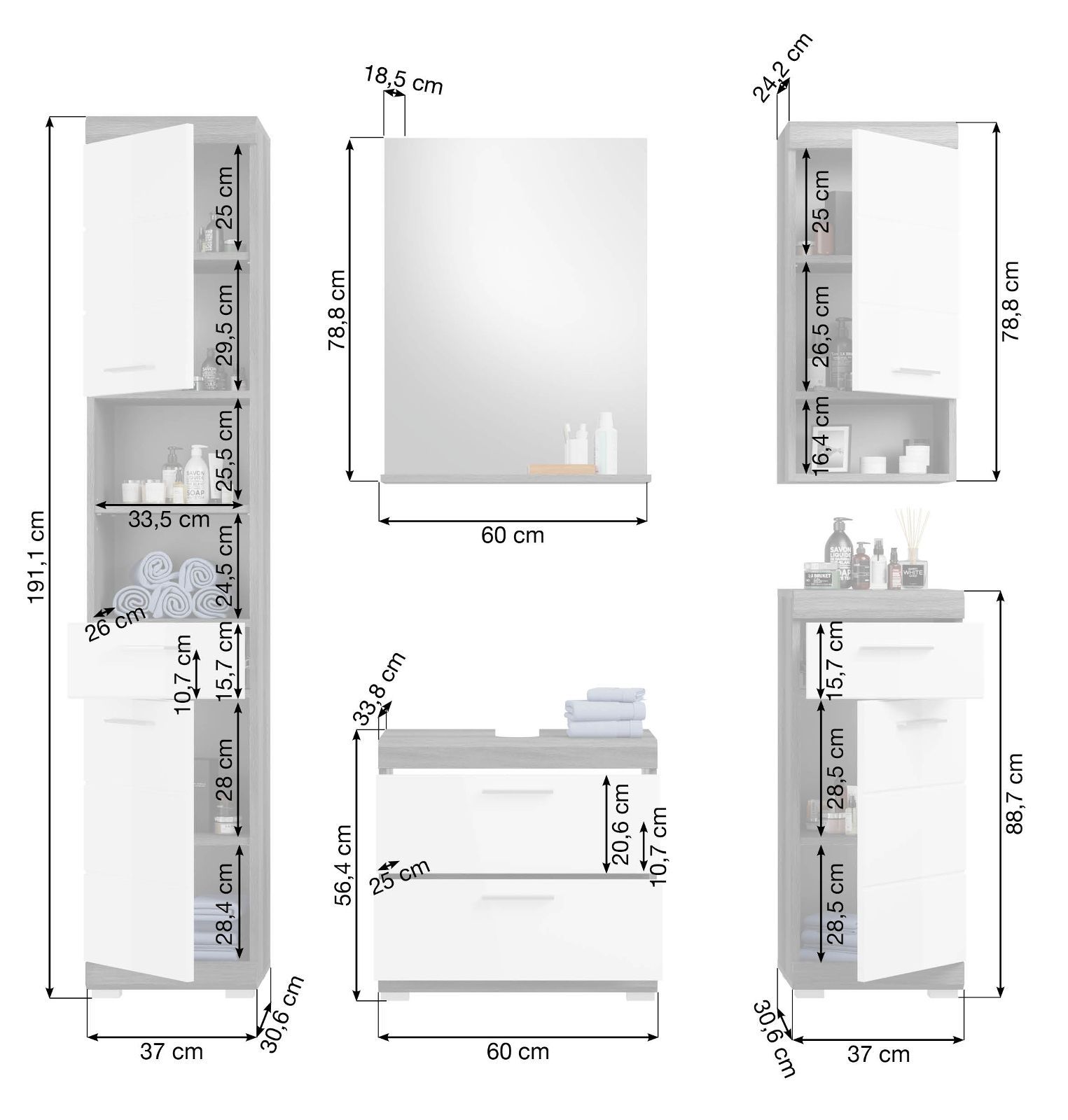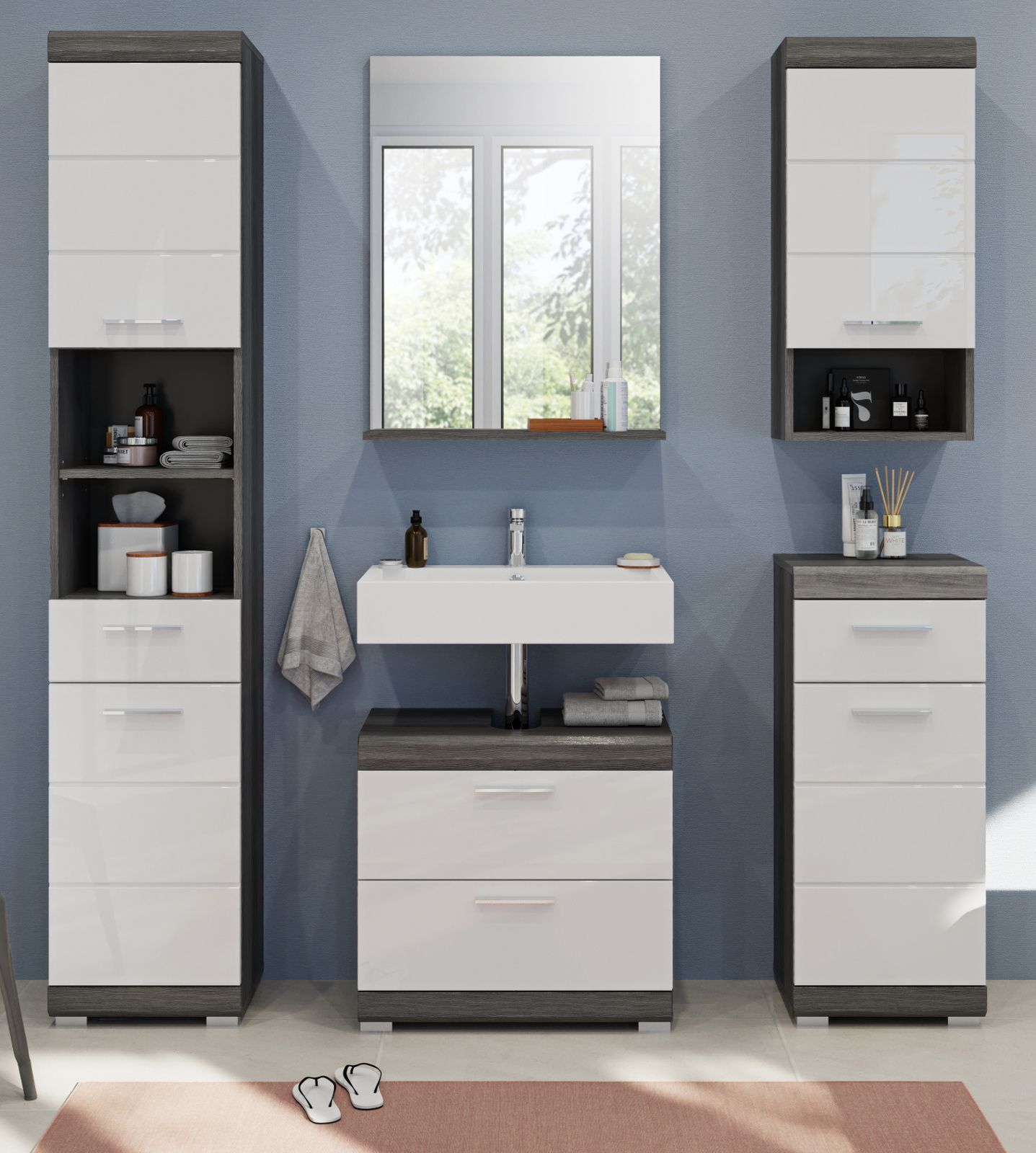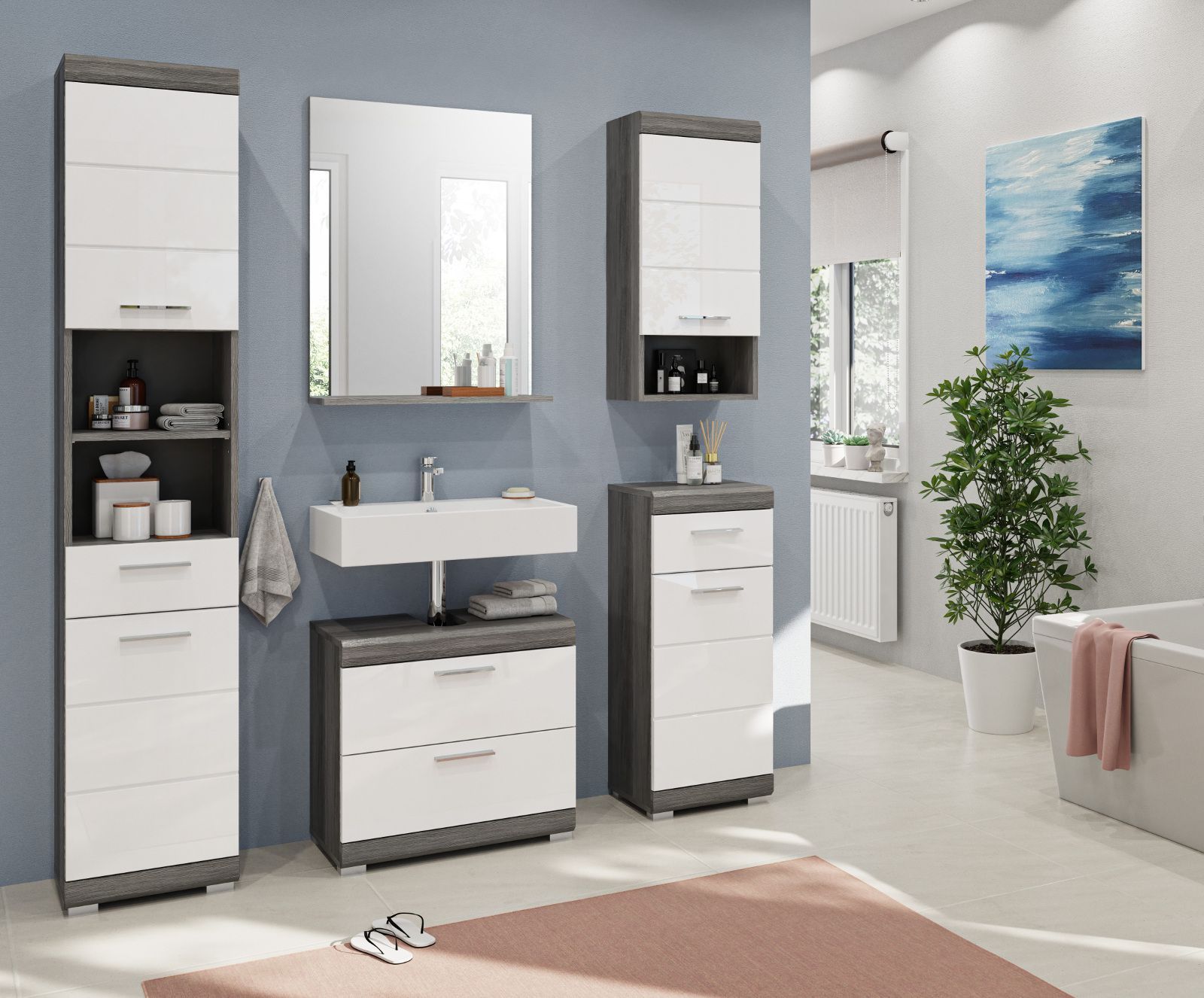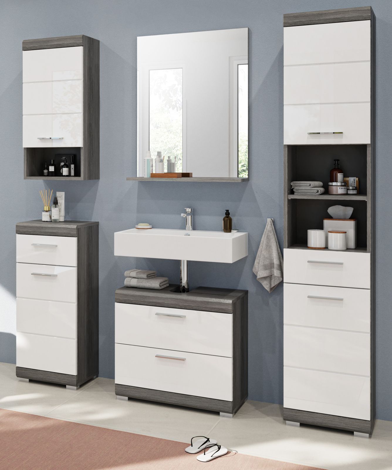 Badezimmer Badmöbel Set in weiß Hochglanz grau Bad Einrichtung Hochschrank Shawn