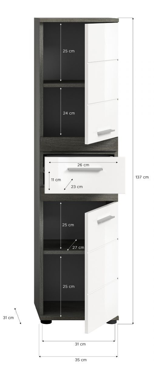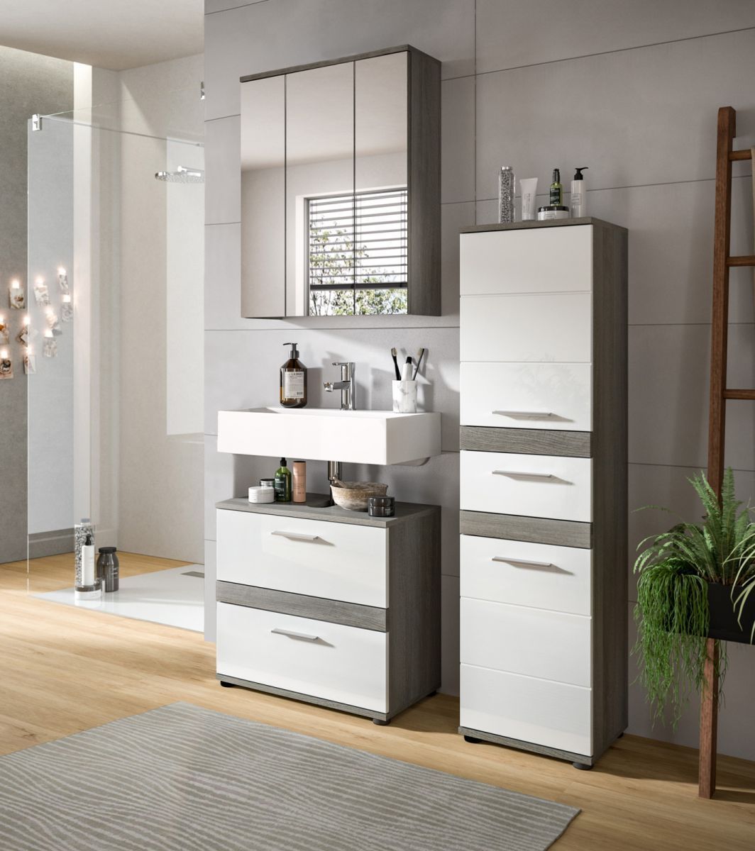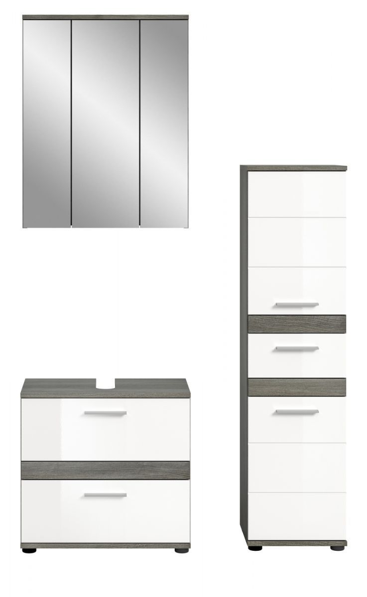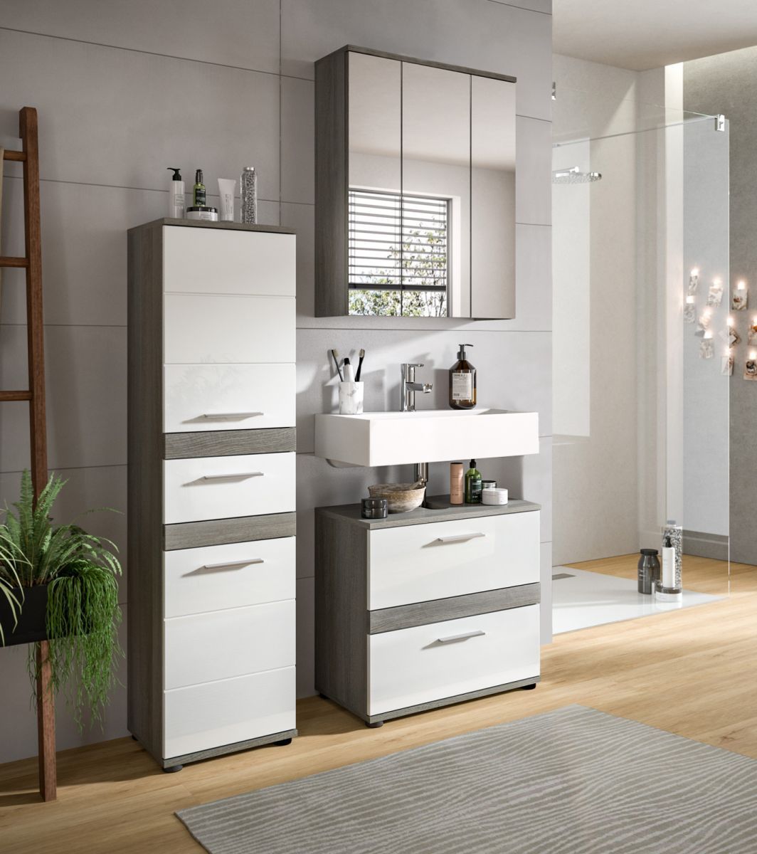 Badezimmer Badmöbel Set weiß Hochglanz grau Badkombination mit Midischrank Bailey