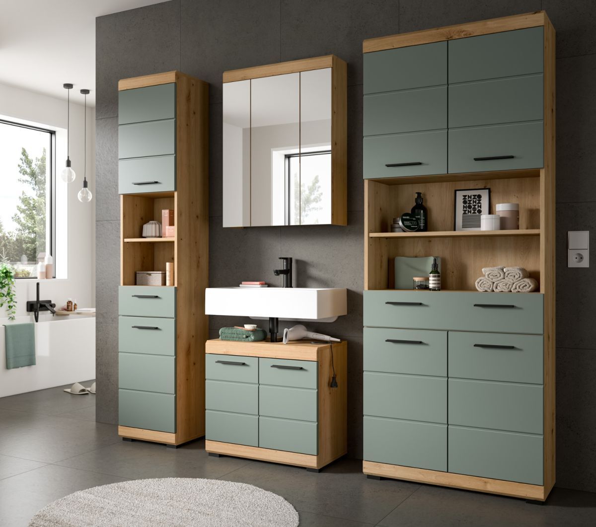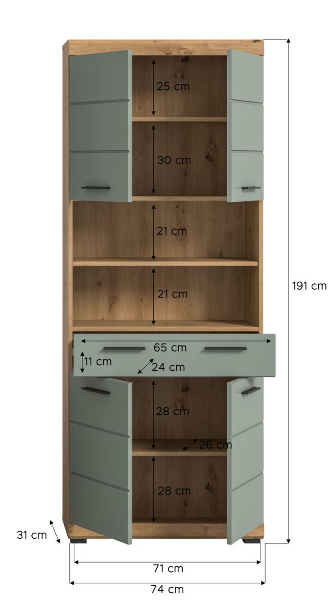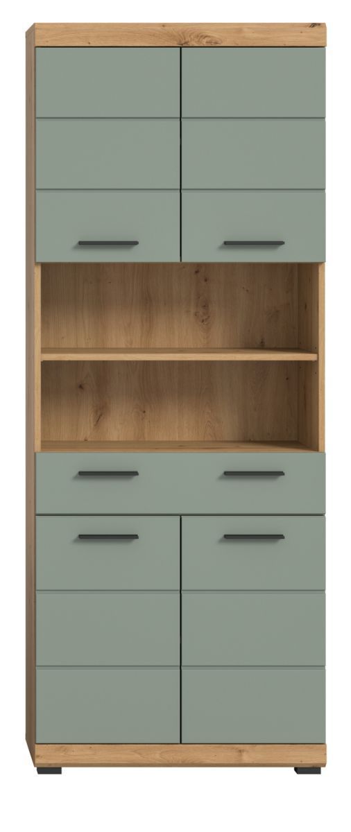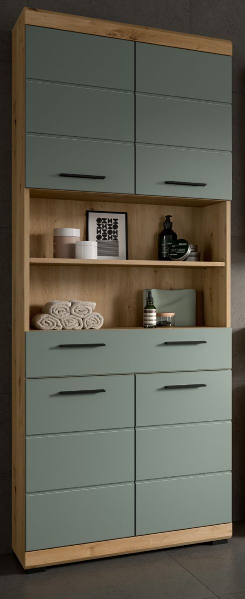 Badezimmer Hochschrank Badschrank Salbei grün Eiche 4-trg 74 x 191 cm Badmöbel Shawn