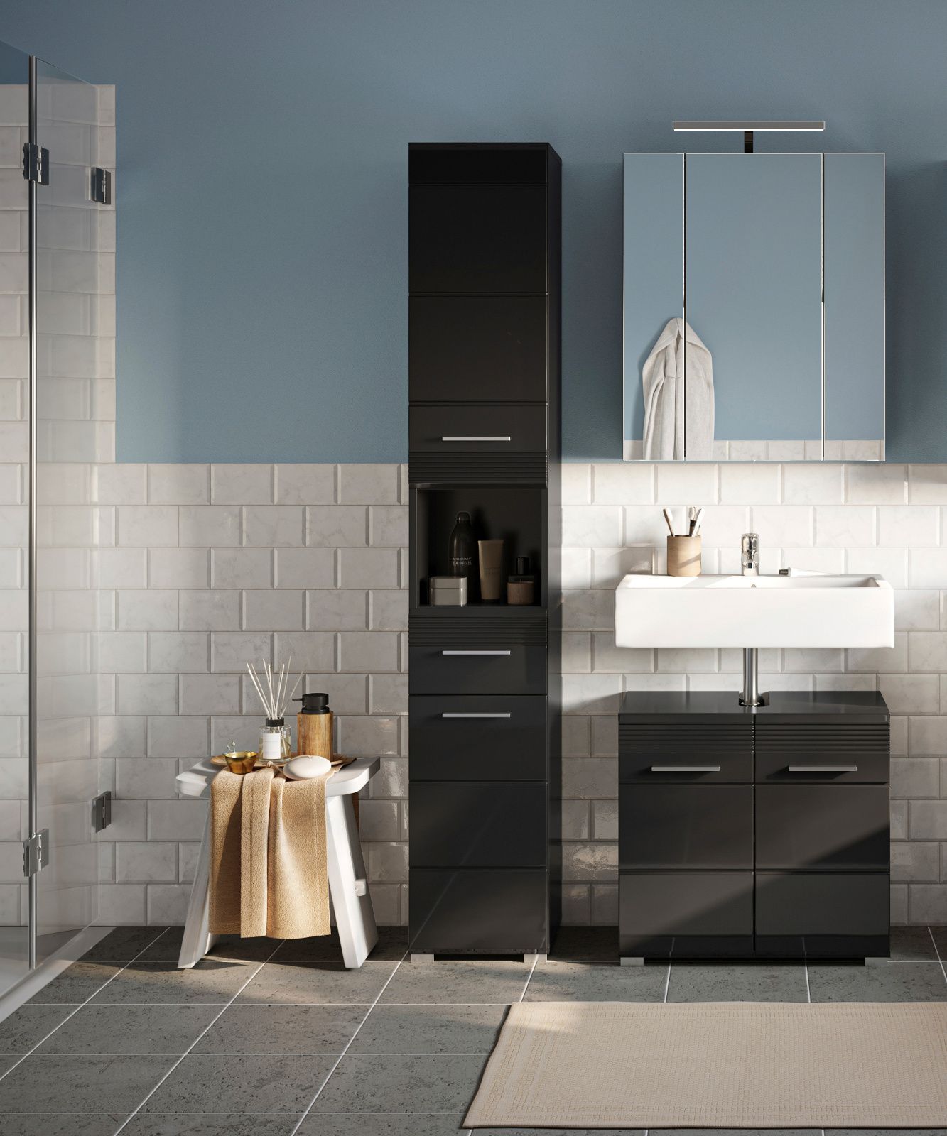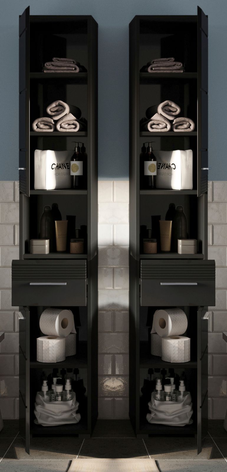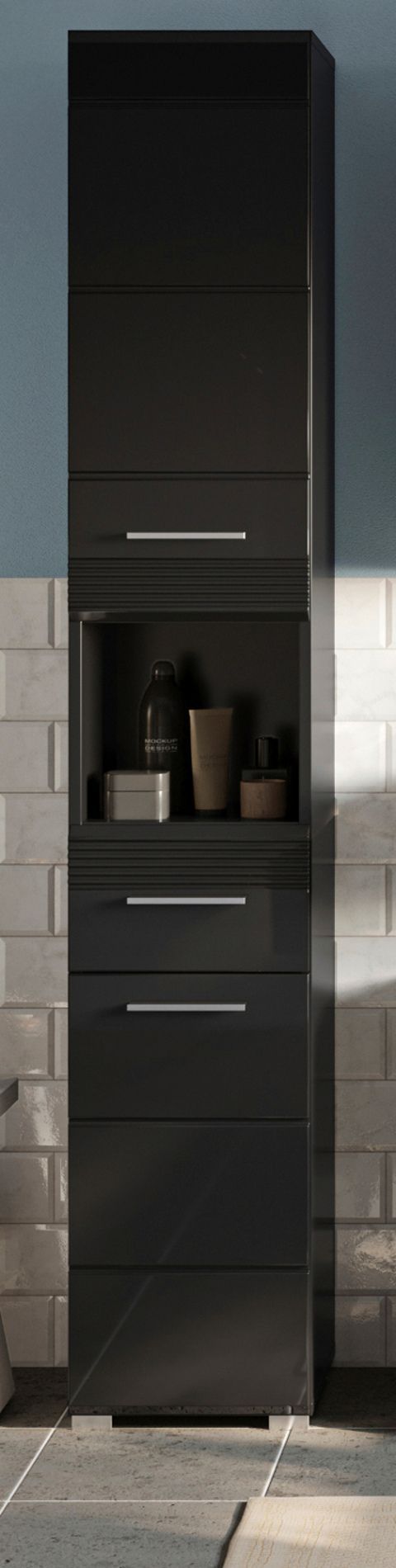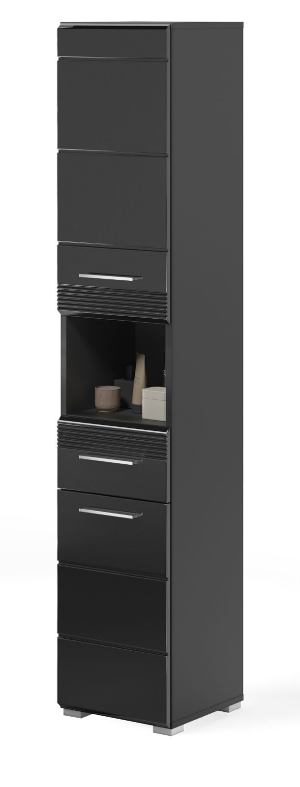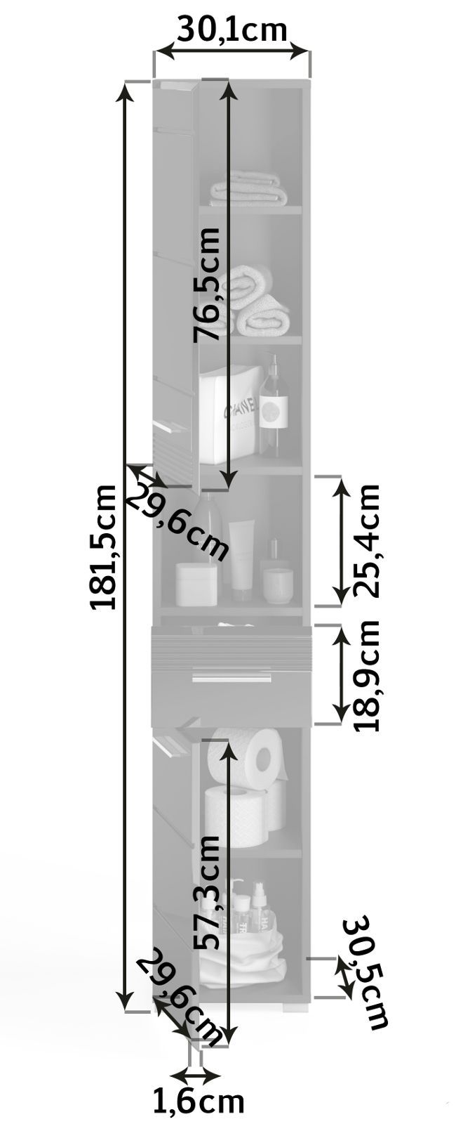 Badezimmer Hochschrank "Leon" in schwarz Hochglanz Badschrank 30 x 182 cm