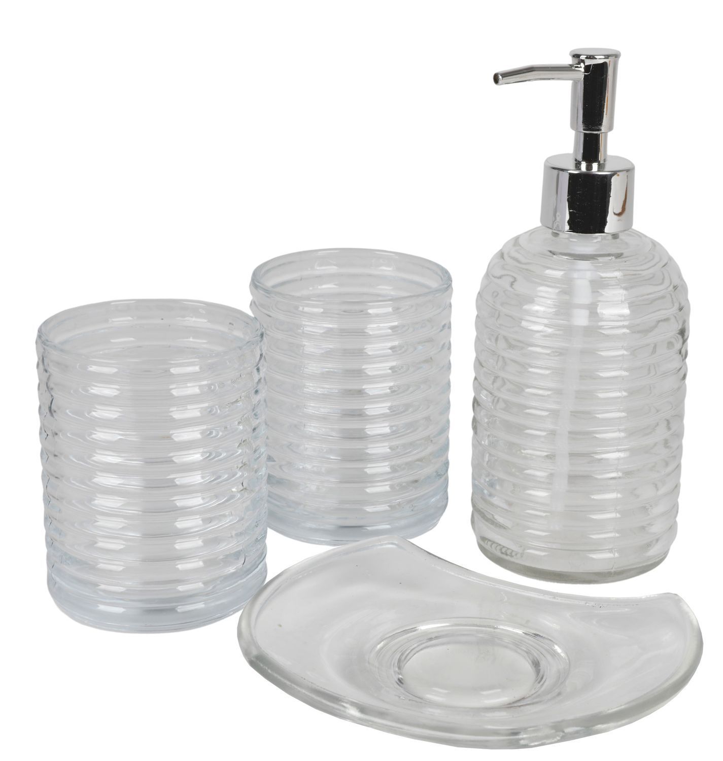 Badezimmer-Set aus Glas Seifenspender Seifenschale Zahnputzbecher Badaccessoires