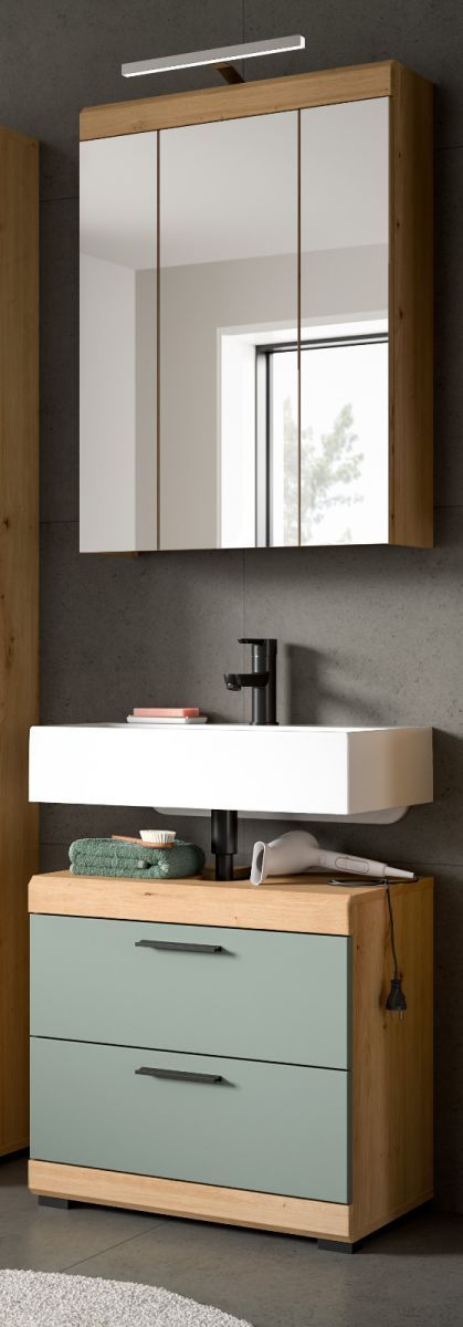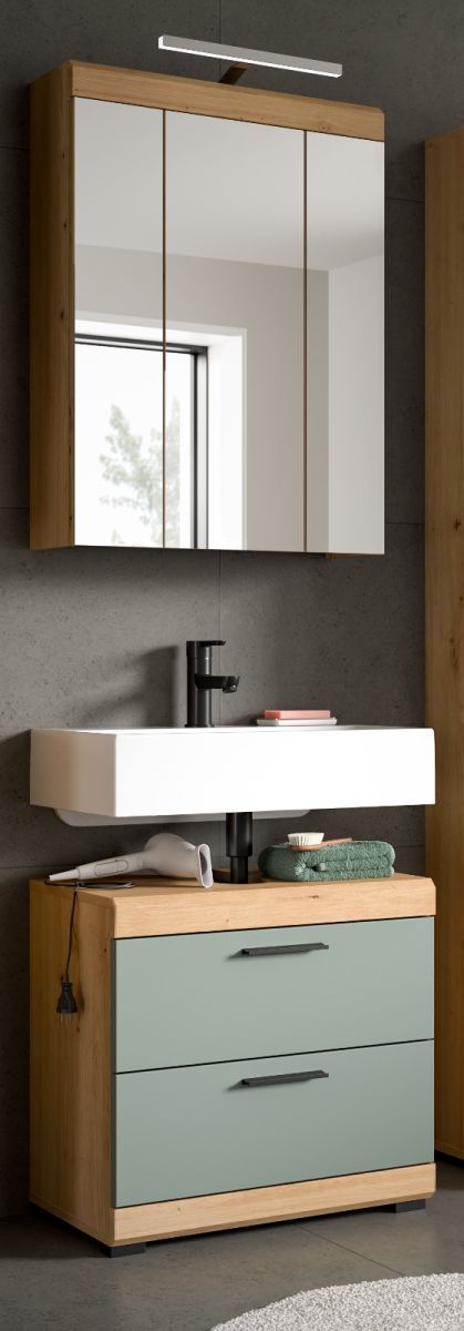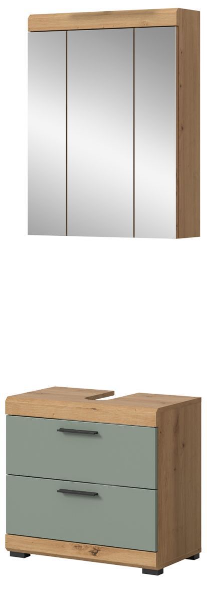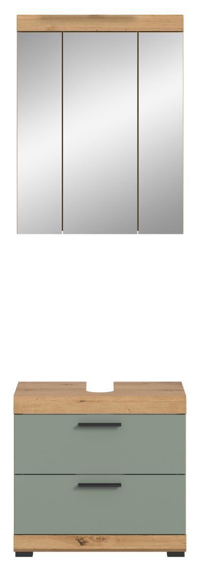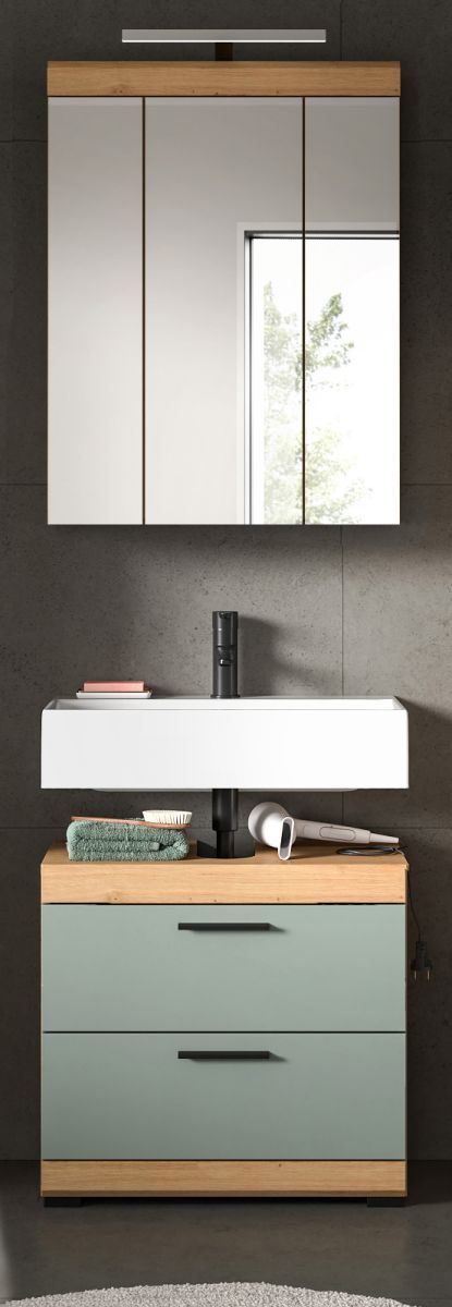 Badezimmer Set mit Waschbeckenunterschrank Spiegelschrank in Salbei grün Eiche Shawn