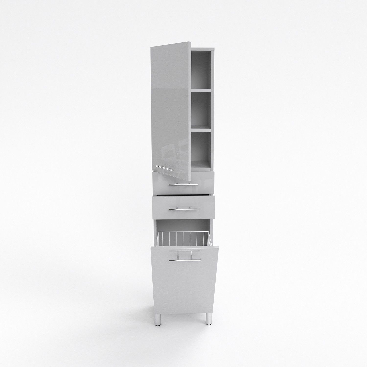 Badezimmerschrank Hochschrank mit Wäschekorb SW15 40 cm Weiß Hochglanz metallgriffe