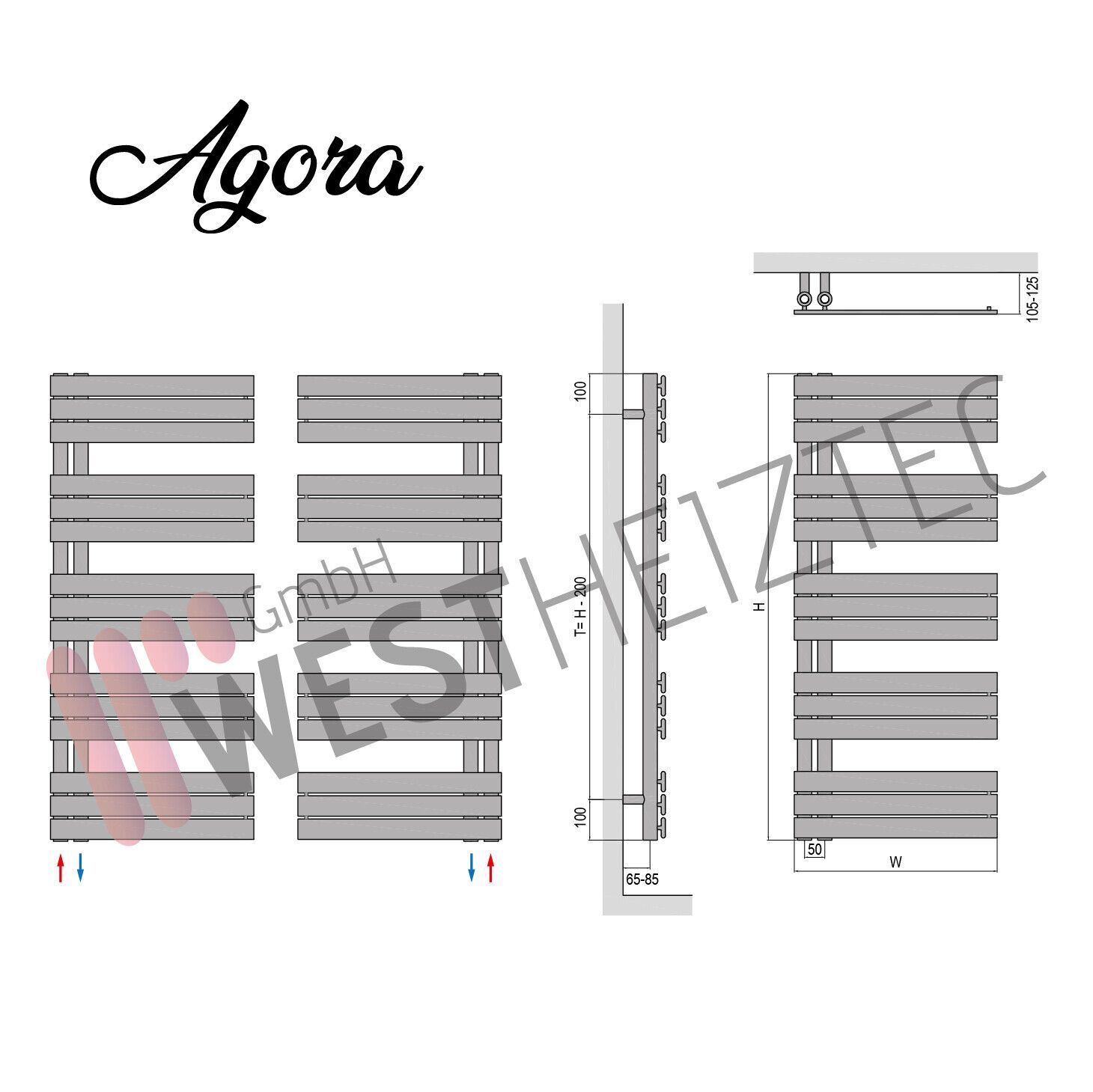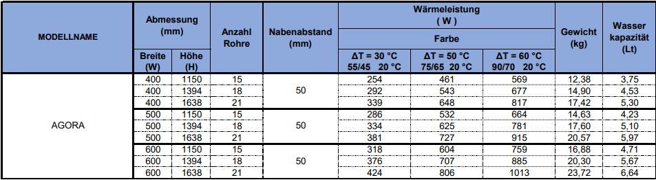 Designheizkörper, Agora, weiß Qualität: Hochwertiger Stahl Pulverbeschichtete Lackierung Betriebsdruck, maximal 4 Bar Hohe Heizleistung TUV ( EN ISO 9001 : 2008) EN 442 Euronorm zertifiziert RAL 9016 - RAL 7016 Technische Daten: Horizontale Paneele, 50 x 11 mm Vertikale Rohre, 30 mm Durchmesser Ansc