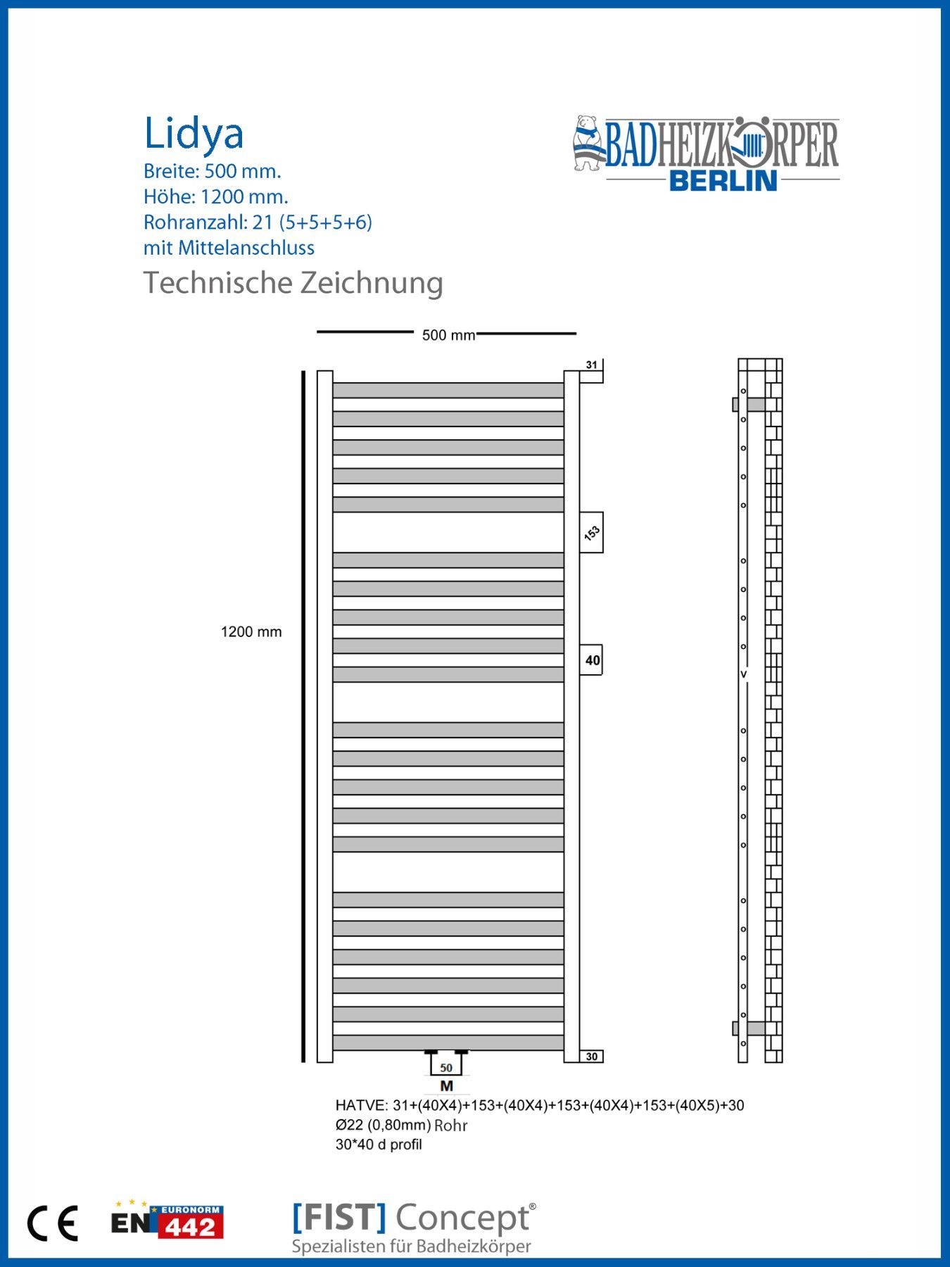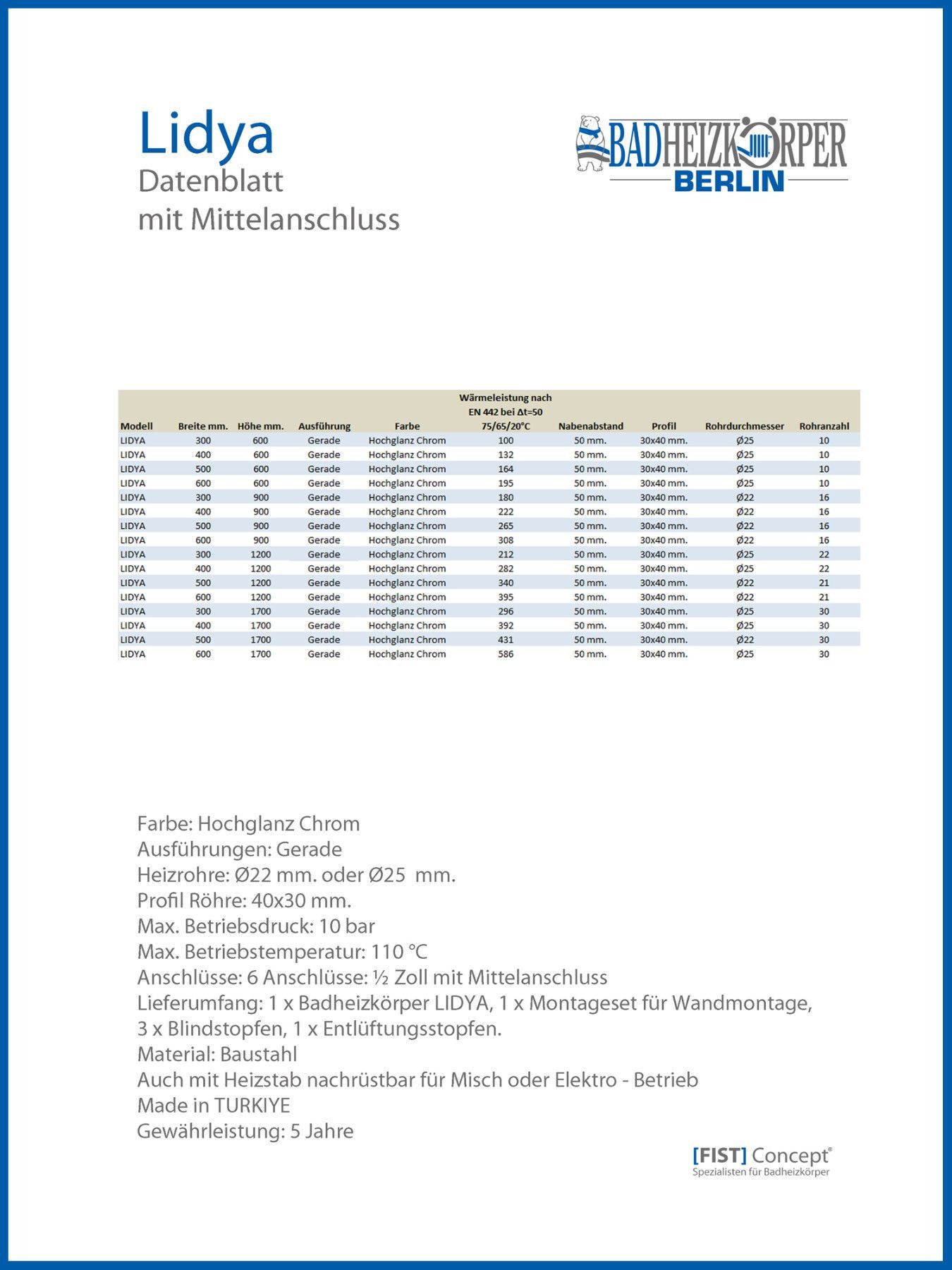 Badheizkörper LIDYA Hochglanz Chrom Breite: 500 mm. Höhe: 1200 mm. Mittelanschluss