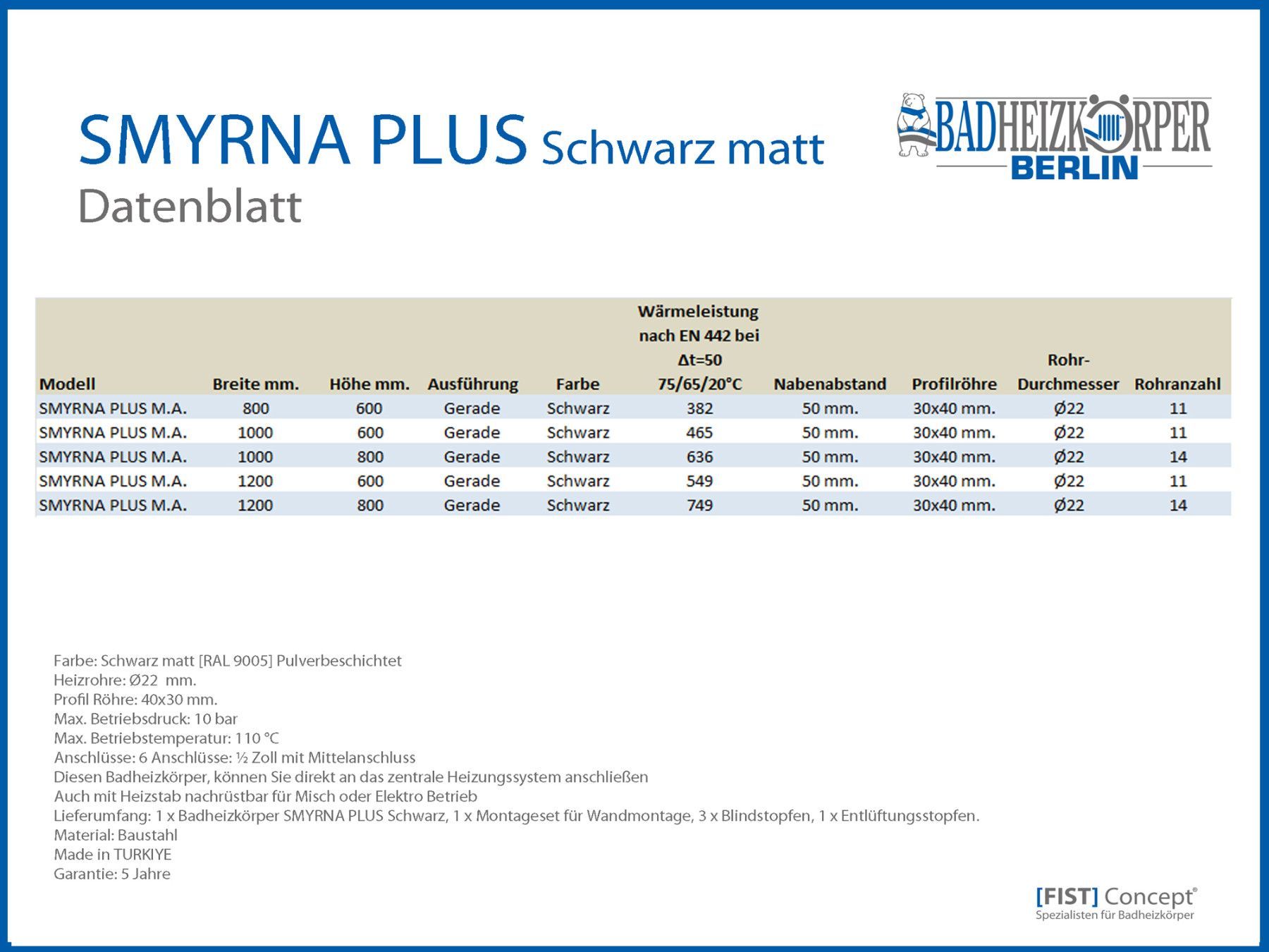 Badheizkörper SMYRNA PLUS Schwarz Matt 1000 x 800 mm. Gerade mit Mittelanschluss