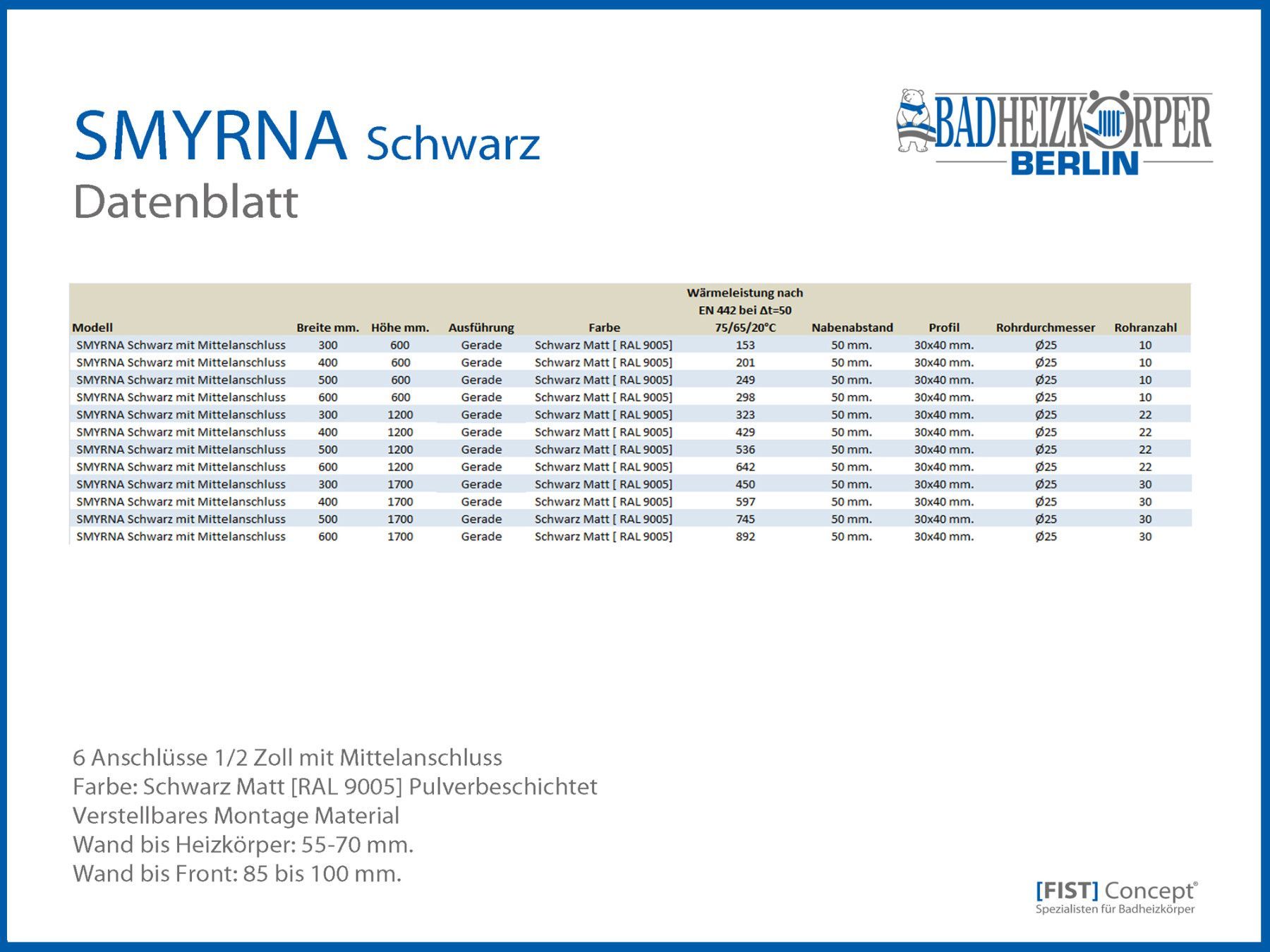 Badheizkörper SMYRNA Schwarz Matt Breite: 300 mm. Höhe: 1200 mm. Mittelanschluss