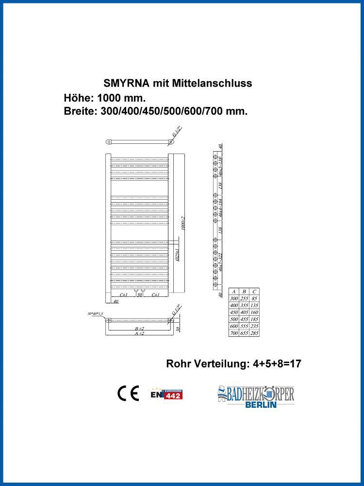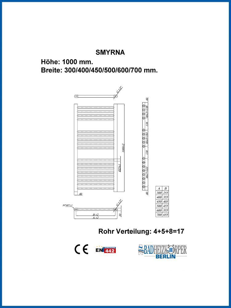 Badheizkörper SMYRNA Weiß 400 x 1000 mm. Gerade oder Gebogen